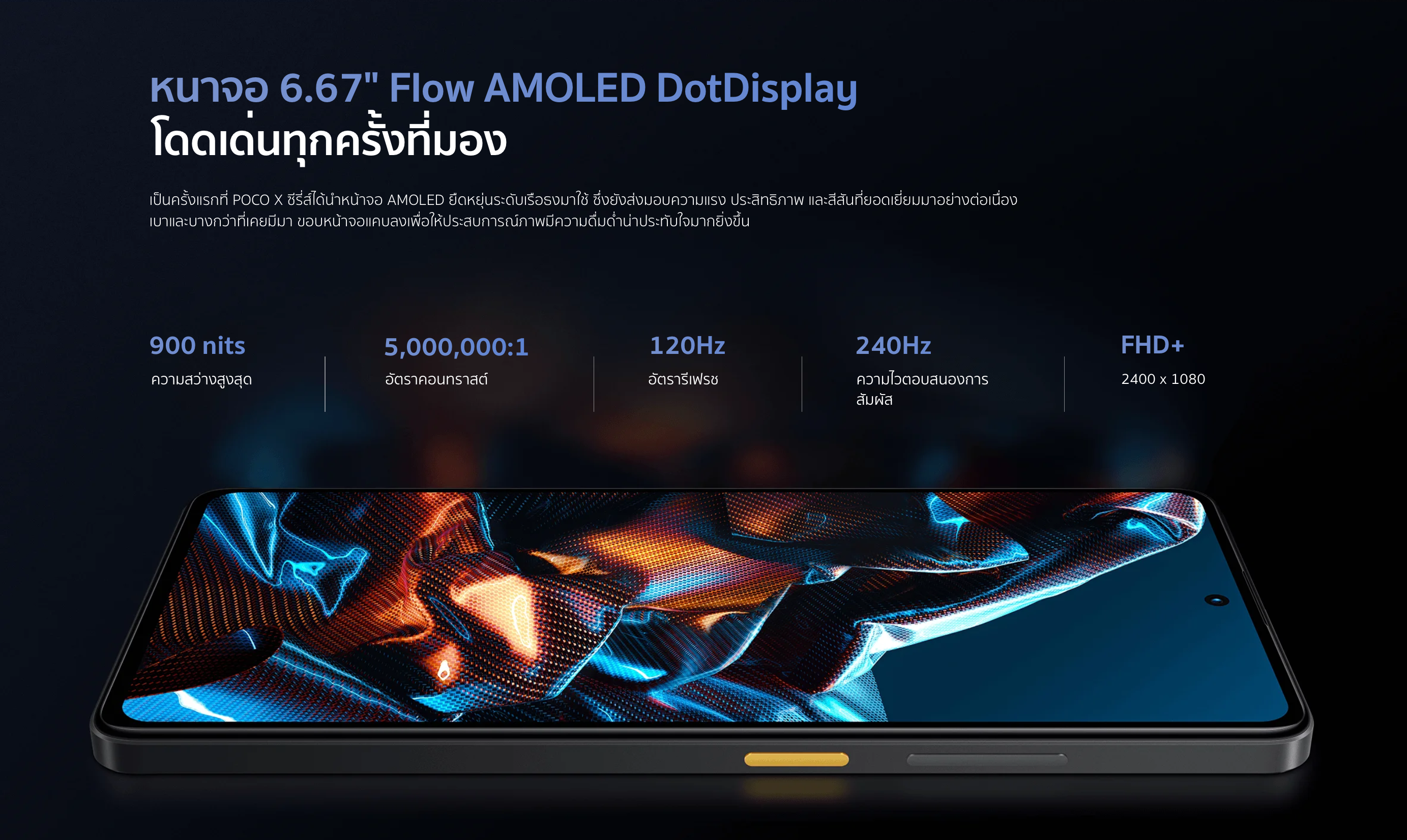 เป็นครั้งแรกที่ POCO X Series อัปเกรดไปใช้จอ AMOLED DotDisplay น้ำหนักเบาและบาง ขอบหน้าจอแคบลง ขนาด 6.67″ ความละเอียด 2400×1080 (FHD+) สว่างสูงสุด 900 nits มี Refresh Rate 120Hz และมีความไวต่อการสัมผัสที่ 240Hz