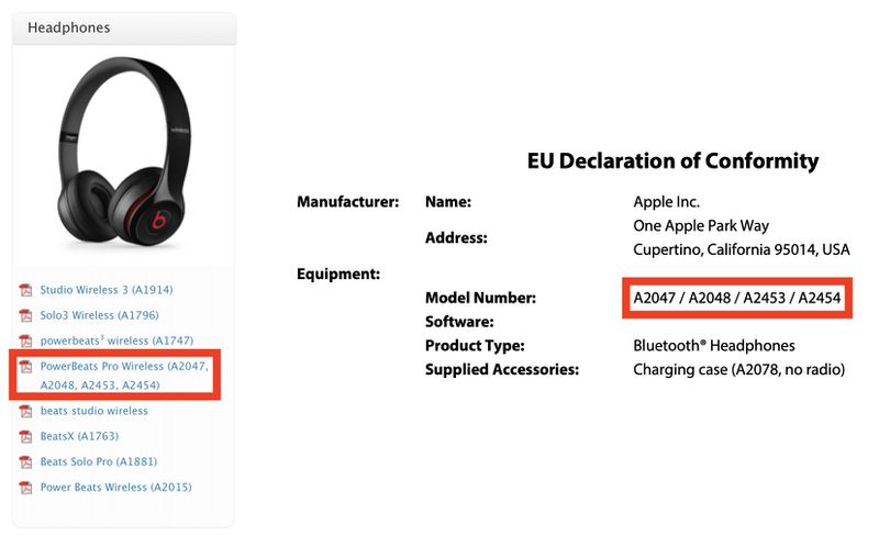 Apple แสดงรายใบรับรองในภูมิภาคยุโรปไว้ที่เว็บไซต์ โดยในหน้าสินค้า Beats ก็ระบุเลขโมเดล A2047, A2048 และ A2453, A2454 ตัวใหม่ด้วย ชี้ว่า Apple ได้กำหนดเลขโมเดลใหม่ให้กับ Powerbeats Pro ตัวที่ขายปัจจุบันด้วย