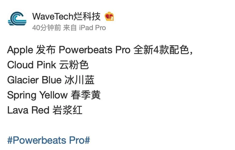 รายงานระบุว่า Powerbeats Pro จะมาพร้อมสีใหม่อย่าง Cloud Pink, Glacier Blue, Spring Yellow และ Lava Red ซึ่งสีสันสดใสกว่า สว่างกว่าสีของรุ่นก่อนหน้า
