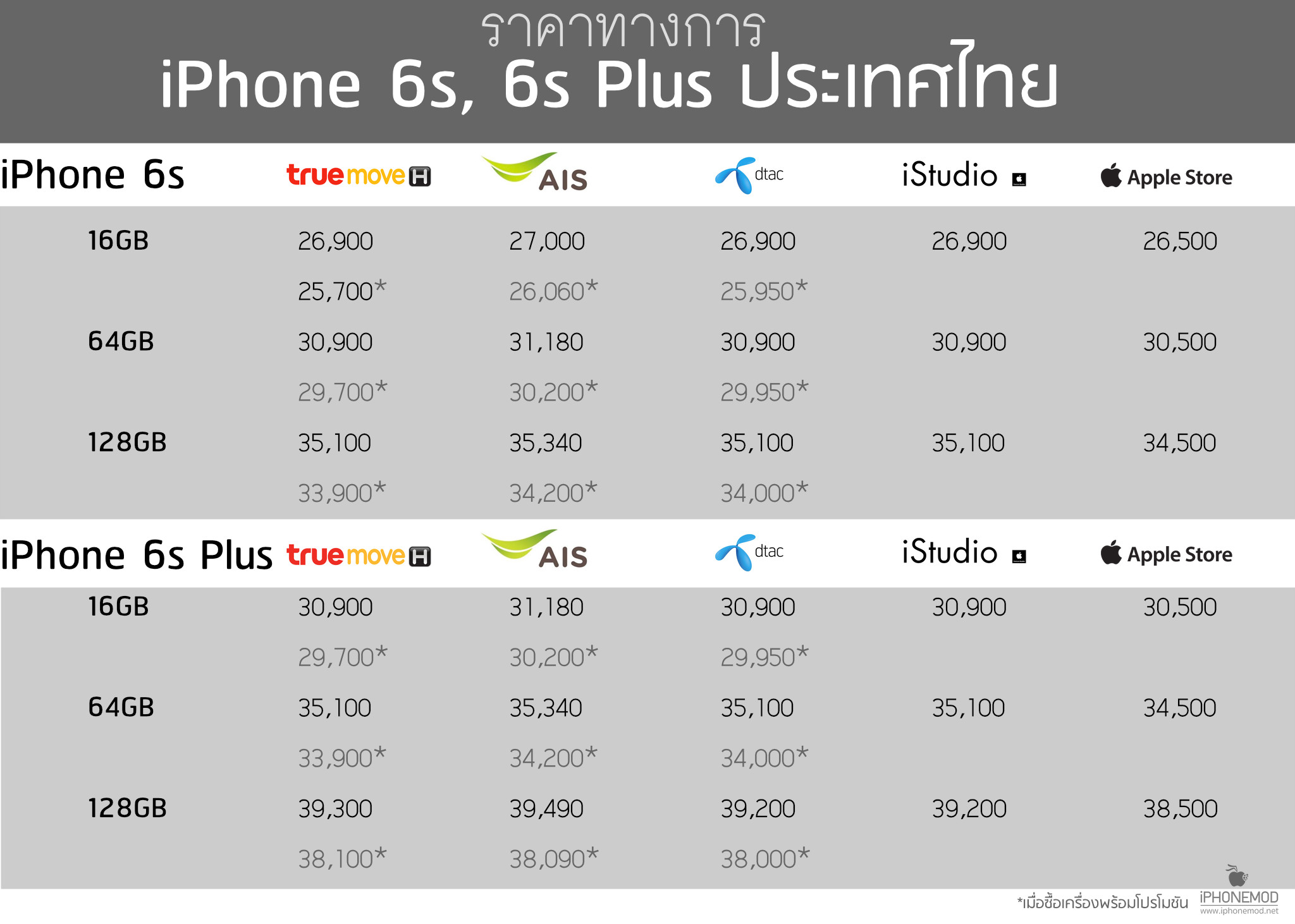 ข้อมูลล่าสุด ณ ตอนนี้ยังไม่มีราคาที่เป็นทางการของ iPhone 7 ออกมาจากทุกค่ายครับ หากลองย้อนกลับไปดูราคา iPhone 6s เมื่อปีทีแล้วราคาจะเป็นดังนี้ครับ