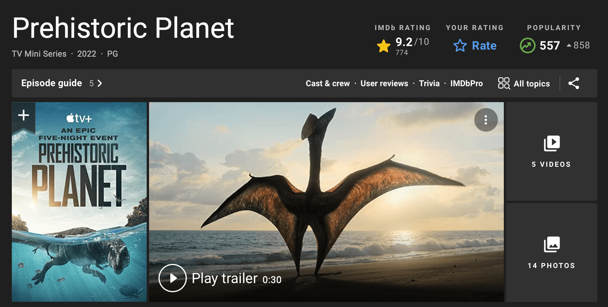 Prehistoric Planet เป็นสารคดีบน Apple TV+ ที่พาเราย้อนเวลากลับไปเมื่อ 66 ล้านปีก่อน เมื่อเหล่าไดโนเสาร์และสัตว์โลกดึกดำบรรพ์น่าทึ่งกระจายตัวอยู่ทั้งบนแผ่นดิน แผ่นน้ำ และ ผืนฟ้า บรรยายโดย Sir David Attenborough และได้ Hans Zimmer เจ้าของรางวัล Academy Award หลายสมัยมาบรรเลงเพลงต้นฉบับ นำเสนอด้วยภาพความละเอียด 4K และ รองรับ Dolby ATMOS ด้วย