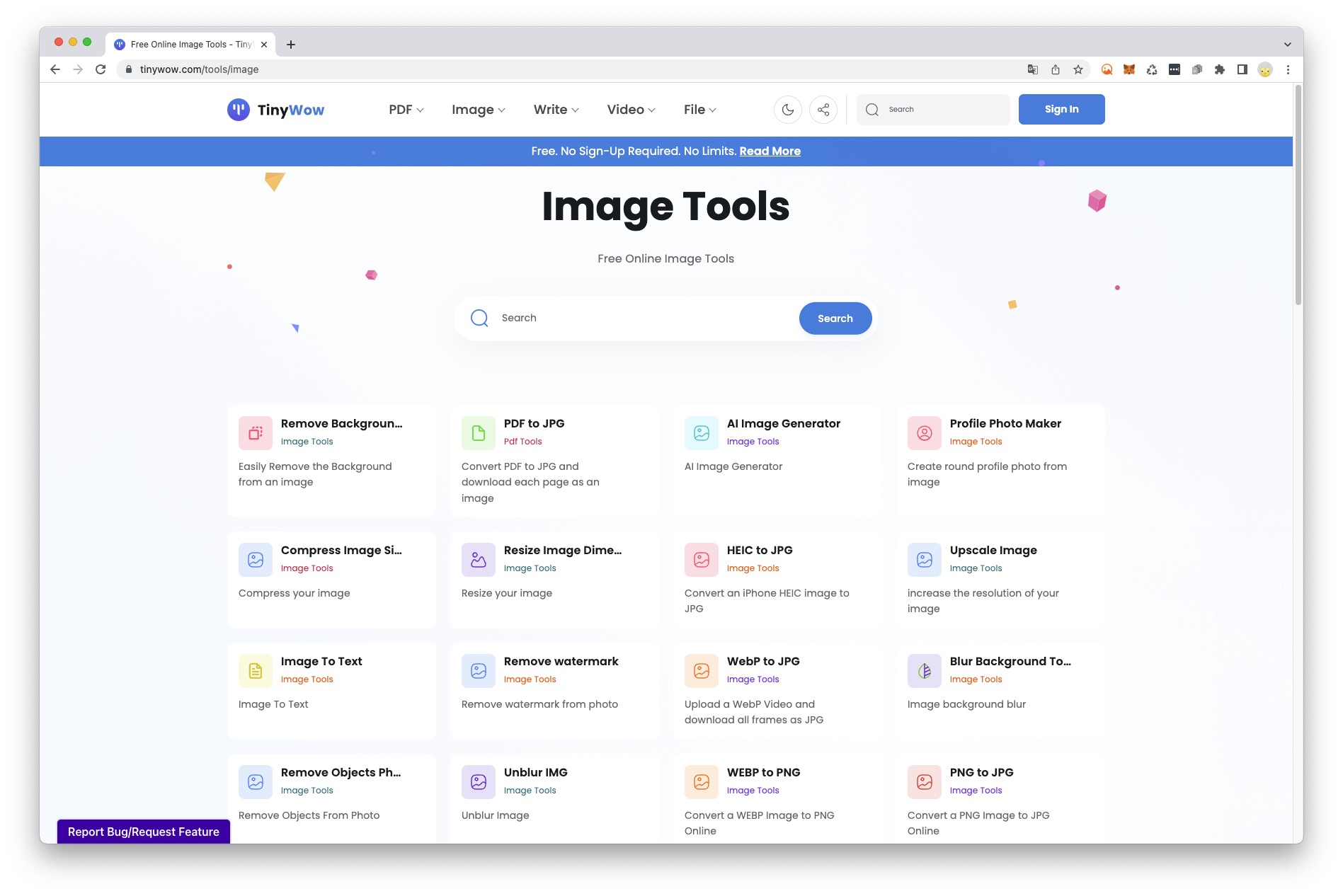 เครื่องมือสำหรับการปรับแต่งหรือจัดการรูปภาพใน TinyWow นั้นมีให้เลือกใช้งานกันถึง 60+ เครื่องมือกันเลยทีเดียว ไม่ว่าจะเป็นการแปลงไฟล์ การปรับแต่งรูปภาพ การปรับขนาดรูปภาพ และอื่น ๆ อีกมากมาย มาชมพรีวิว 4 เครื่องมือกัน