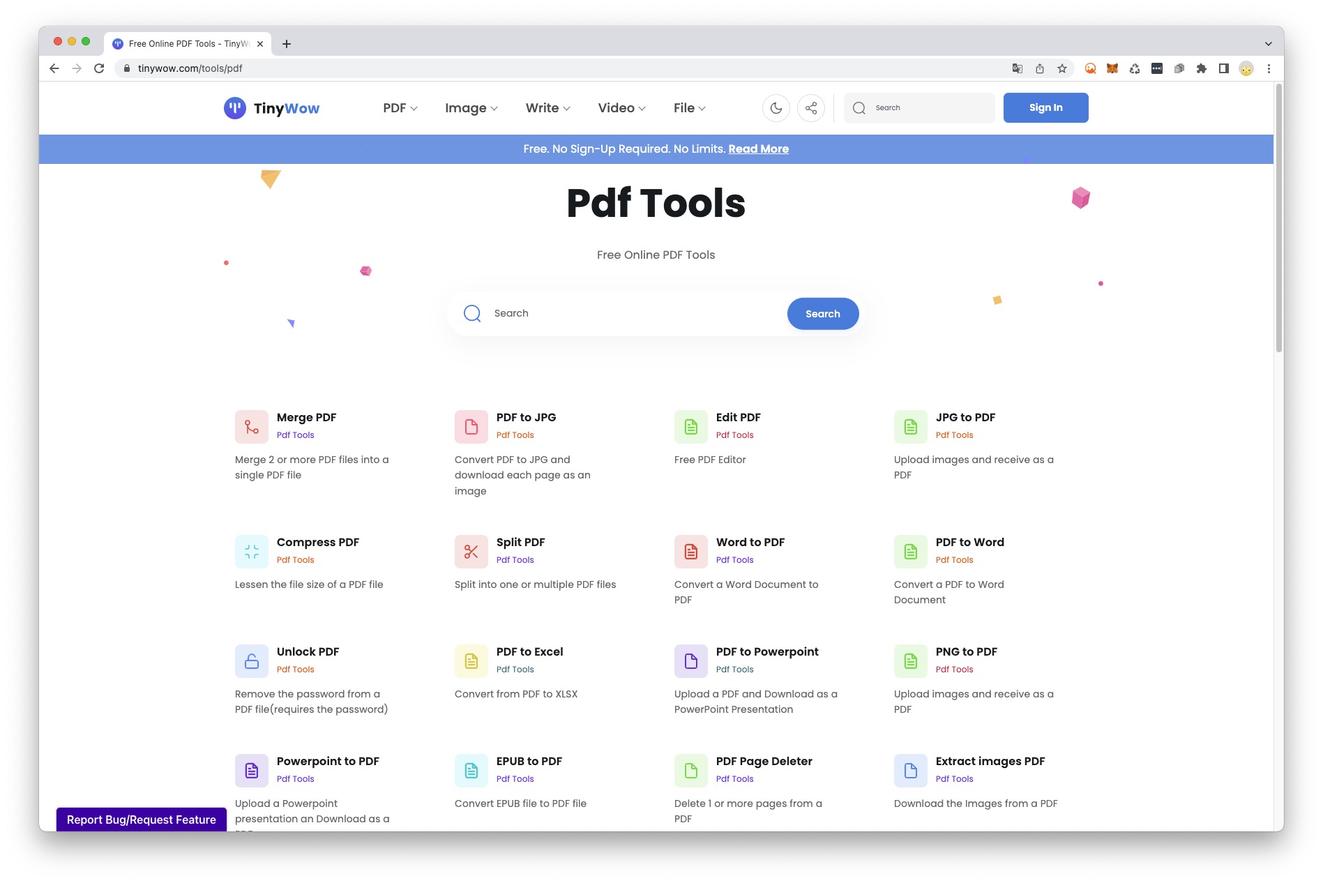 TinyWow ยังมีส่วนของการจัดการไฟล์ PDF โดยเฉพาะ มีเครื่องมือให้เลือกใช้งานมากกว่า 40+ เครื่องมือ มีประโยชน์มาก ๆ สำหรับคนที่ต้องการจัดเอกสารอยู่บ่อย ๆ บอกได้เลยว่าเครื่องมือสำหรับจัดการ PDF มีให้เลือกใช้งานครบครัน เรามาชมตัวอย่างการใช้งานบางเครื่องมือกัน
