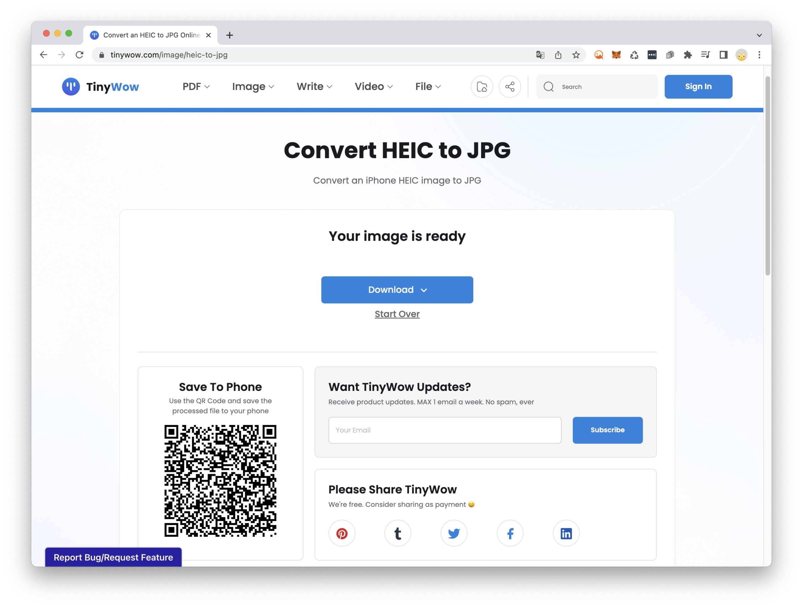 เว็บก็จะทำการแปลงไฟล์จาก HEIC เป็น JPG เราก็สามารถดาวน์โหลดไฟล์ JPG ได้เลย และที่ชอบก็คือ ด้านล่างจะมี QR Code ให้เราใช้โทรศัพท์สแกน เพื่อบันทึกรูปภาพไว้บนมือถือได้ด้วย ไม่ต้องส่งไฟล์ไป ๆ มา ๆ ระหว่างคอมกับมือถือ สะดวกมาก!