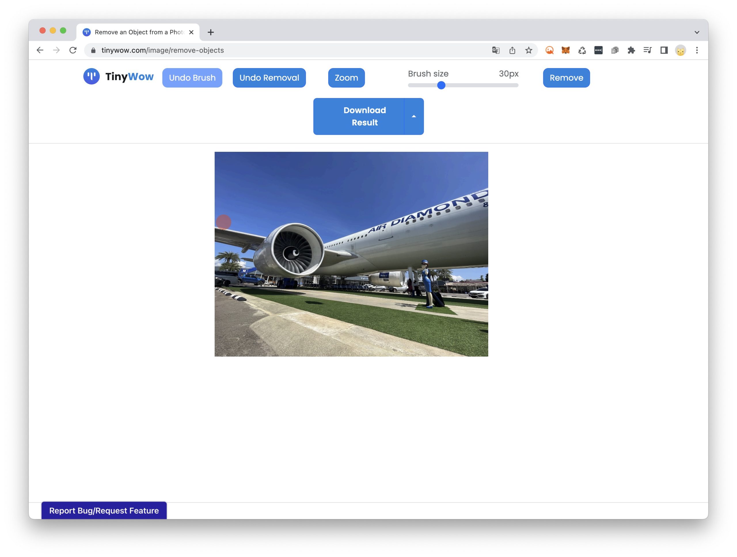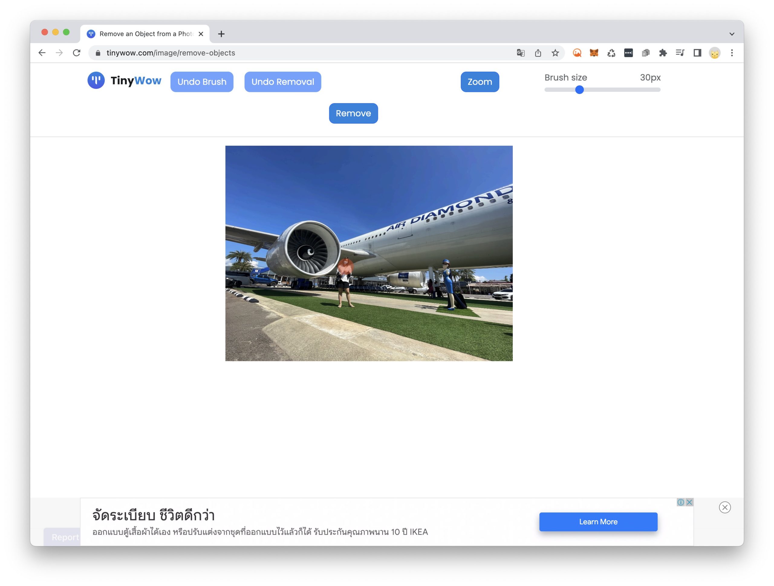 ถ้าหากเราอยากจะลบคนหรือวัตถุบางอย่างในรูปภาพออก เพื่อเหลือไว้เพียงแค่วิวสวย ๆ ก็สามารถทำได้ในเครื่องมือนี้เลย เพียงแค่อัปโหลดรูปขึ้นไป จากนั้นก็ใช้เมาส์ไฮไลท์วัตถุหรือคนออก แล้วก็คลิกปุ่ม Remove