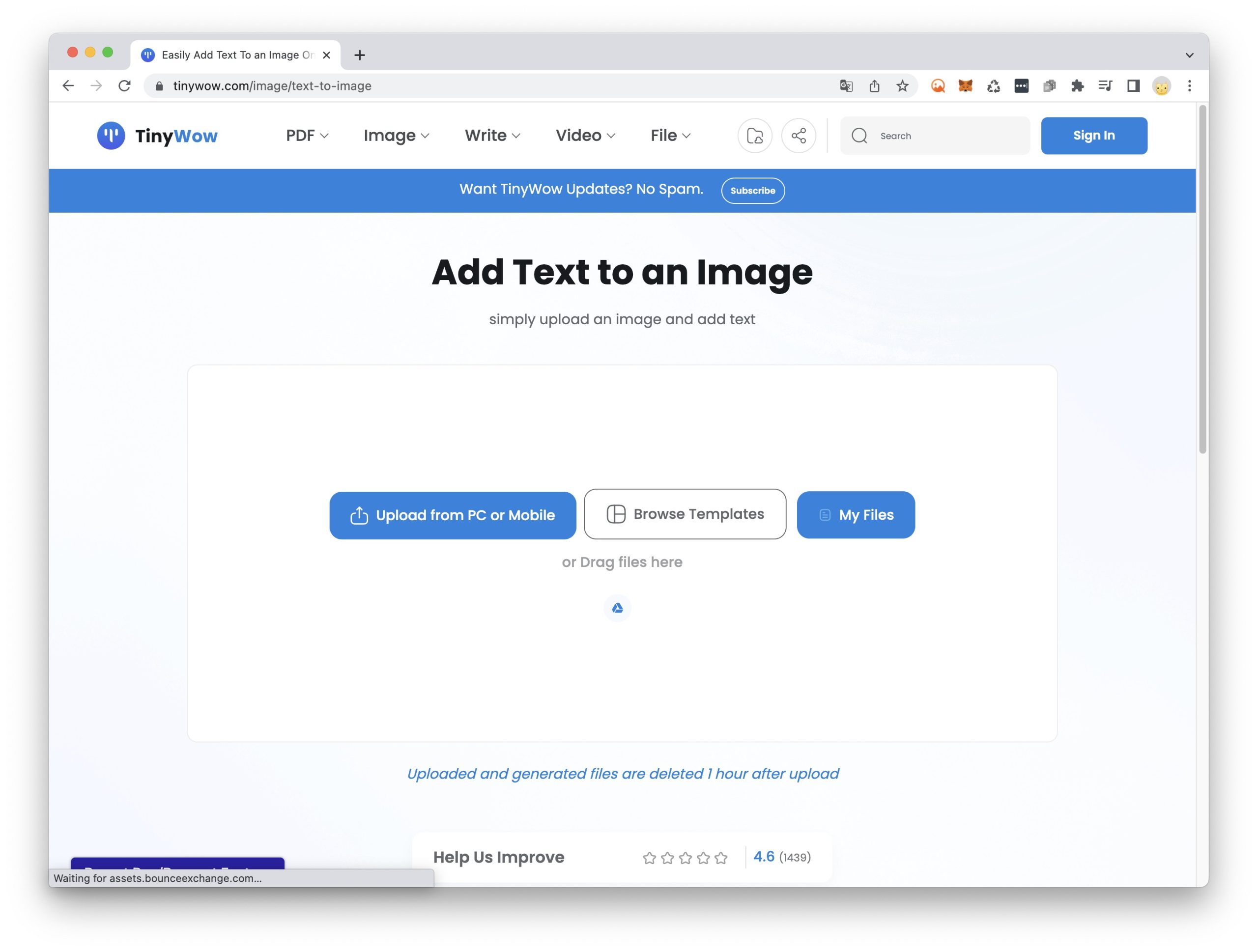 สำหรับใครที่อยากจะใส่ข้อความสวย ๆ ลงในรูปภาพ เพื่อเพิ่มความมีชีวิตชีวามากขึ้น ก็สามารถทำได้ง่าย ๆ เพียงใช้เครื่องมือ Add Text to an Image เริ่มต้นด้วยการอัปโหลดรูปภาพขึ้นไป (หรือจะเลือกจากเทมเพลตก็ได้นะ แต่ยังมีให้เลือกไม่เยอะ)