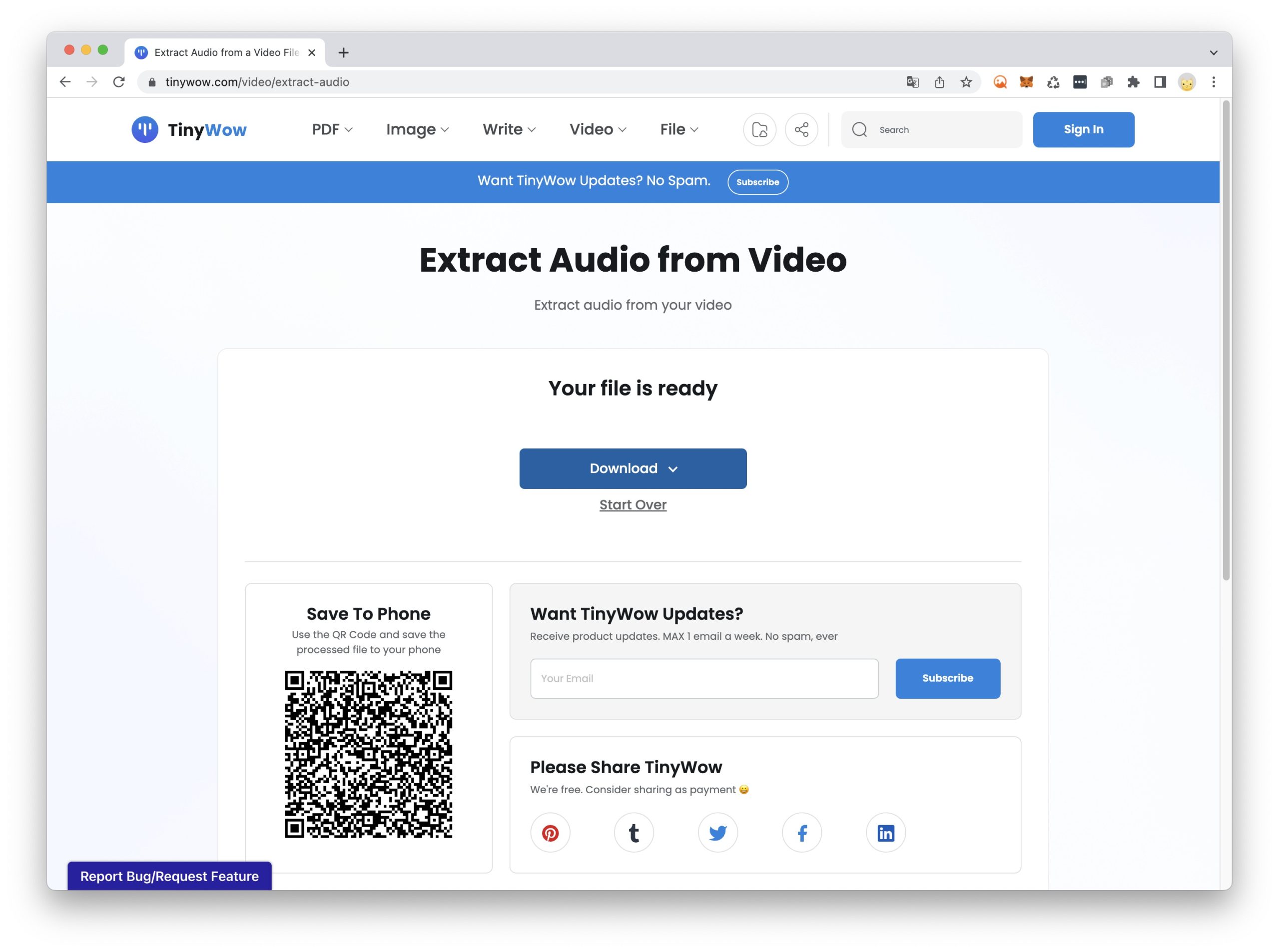 หากเราอยากจะได้เฉพาะไฟล์เสียงจากวิดีโอ อย่างเช่น อยากได้เฉพาะเพลงจากมิวสิควิดีโอ เราก็สามารถใช้เครื่องมือ Extract Audio from Video สำหรับการแยกเสียงได้เลย เพียงอัปโหลดวิดีโอขึ้นไป แล้วรอให้เว็บทำการแยกเสียงให้