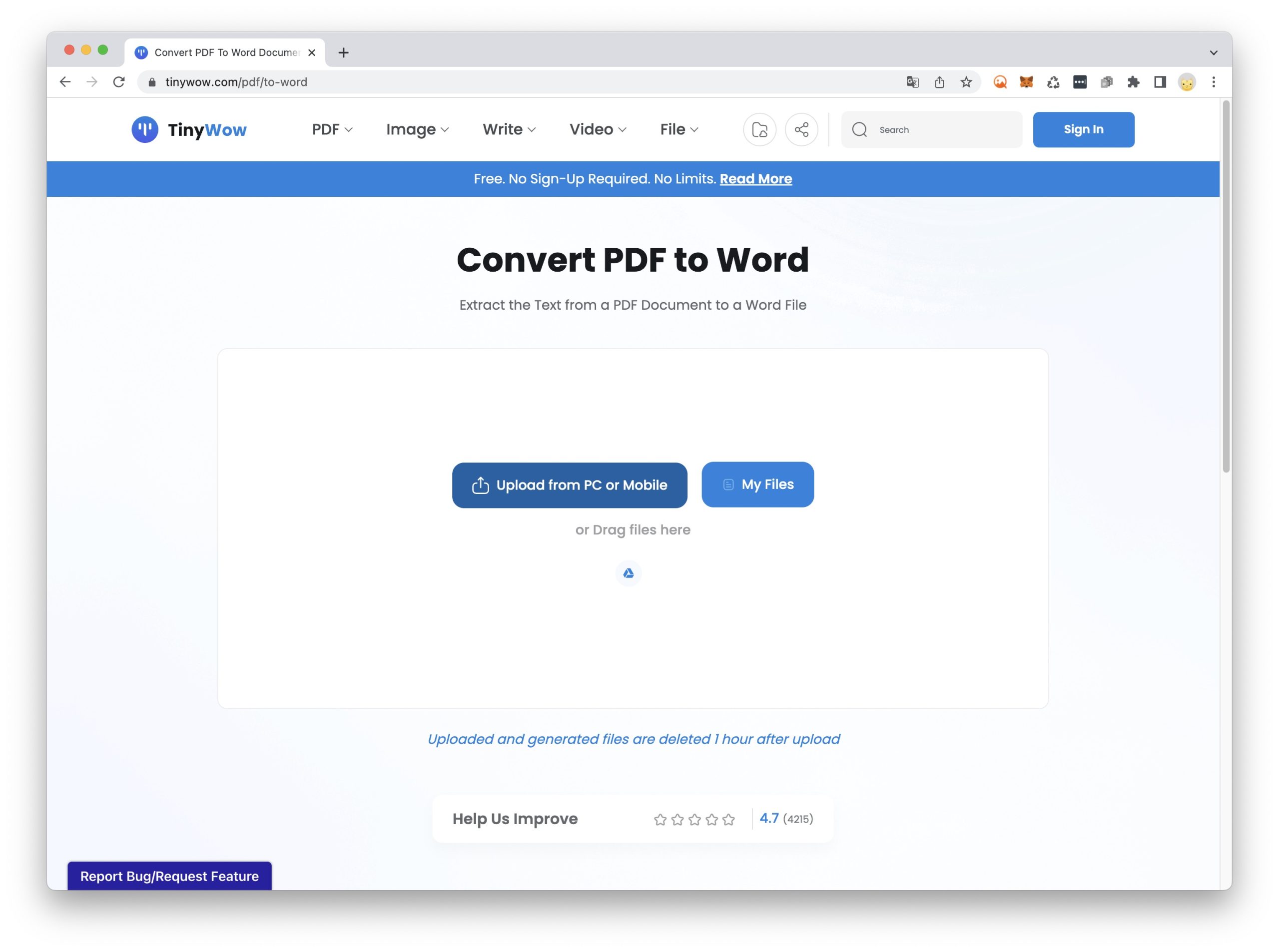 - นอกจากจะได้ใช้งานฟรีเแล้ว เรายังใช้งานทุกเครื่องมือในเว็บไซต์แบบไม่จำกัดด้วย สามารถอัปโหลดไฟล์เพื่อจัดการด้วยเครื่องมือต่าง ๆ แบบ Unlimit ไม่มีจำกัดไฟล์ต่อวัน ต่อครั้ง