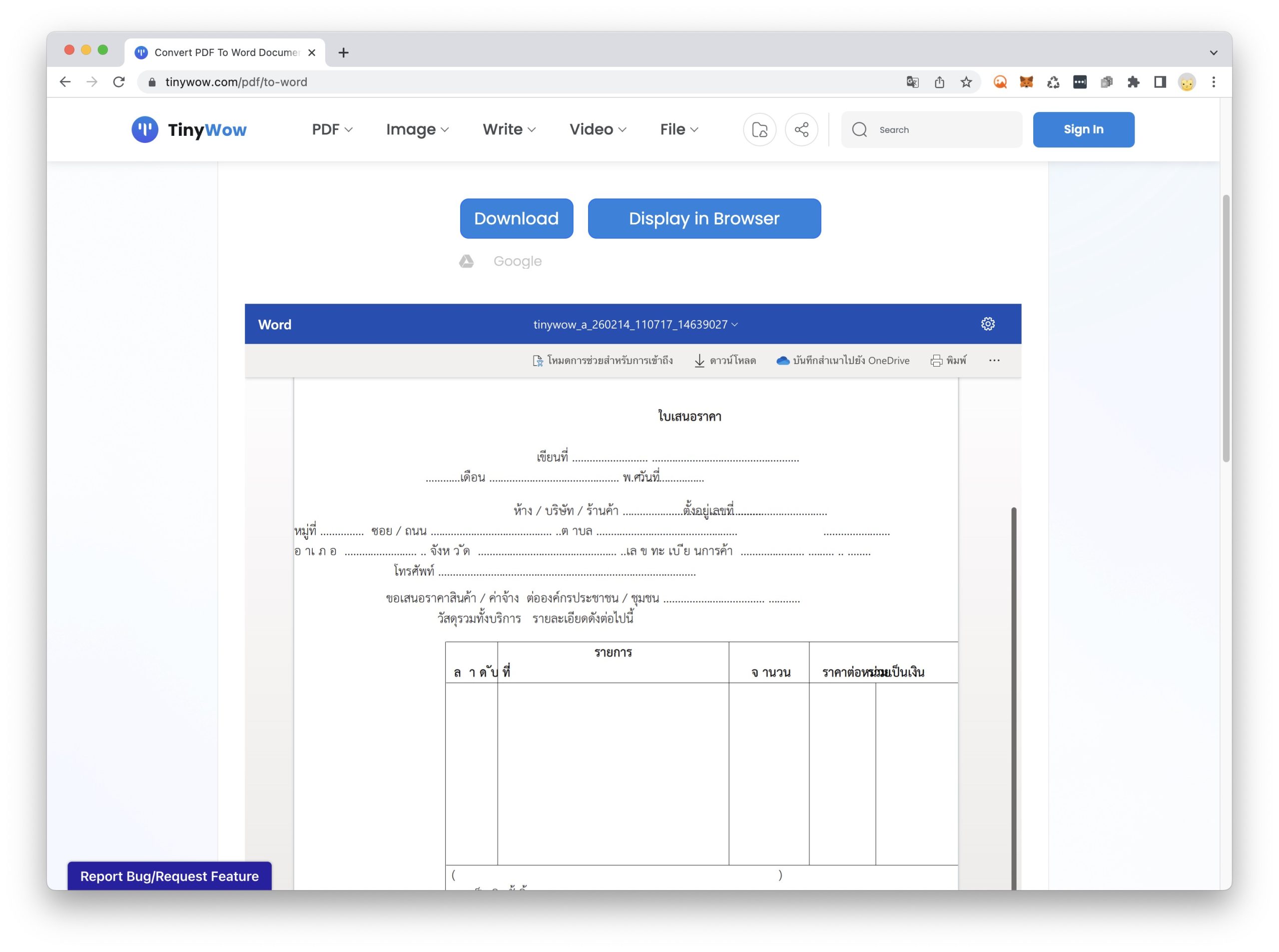 เราก็จะได้ไฟล์ Word มาใช้งาน สามารถชมพรีวิวไฟล์ได้ด้วย เพียงคลิก Display in Browser