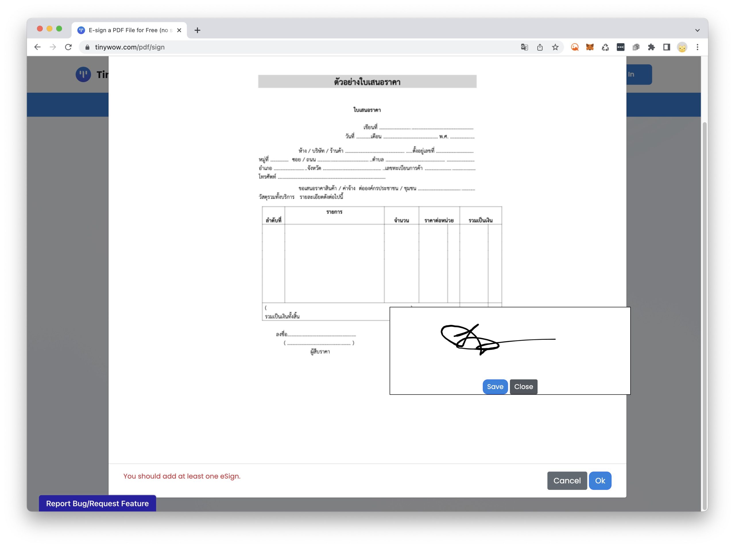 ตัวอย่างเลือกเป็นการเซ็นชื่อ ก็สามารถใช้เมาส์วาดลายเซ็นได้เลย แล้วคลิก Save