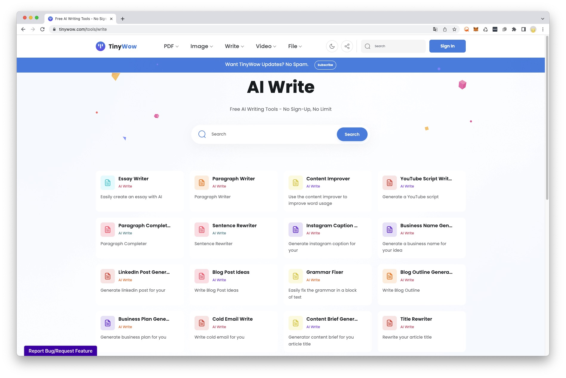 TinyWow เป็นเว็บไซต์ที่รวมเครื่องมือจัดการไฟล์ รูปภาพ วิดีโอ เอกสาร รวมถึงเครื่องมือ AI สำหรับการเขียนงานที่อำนวยความสะดวกให้กับผู้ใช้ มีเครื่องมือให้เลือกใช้งานมากกว่า 200+ ใช้งานออนไลน์ฟรี ไม่มีค่าใช้จ่าย และไม่จำเป็นต้องสมัครสมาชิกด้วย [เข้าใช้งานเว็บ TinyWow ที่นี่]