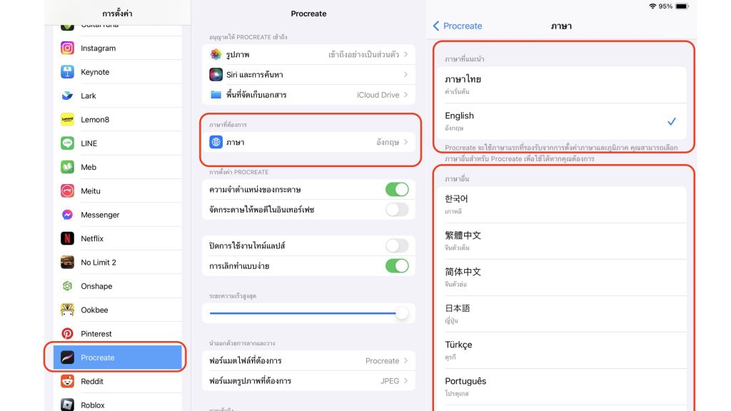 ไปที่การตั้งค่า > เลือกแอป Procreate > ภาษาที่ต้องการ >เลือกภาษาที่เราต้องการ