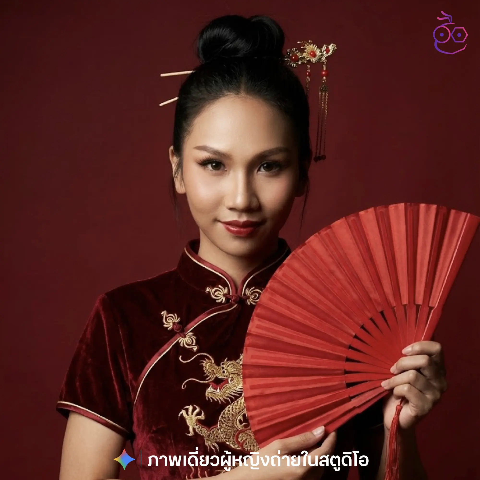 สร้างภาพขนาด 4:5 โดยใช้ภาพที่อัปโหลดไว้เป็นภาพอ้างอิงโดยรักษาความเหมือนของใบหน้า และอัตลักษณ์เดิมไว้อย่างครบถ้วน ภาพถ่ายแฟชั่นสไตล์จีนร่วมสมัย นางแบบผู้หญิงครึ่งตัวหรือครึ่งอก หันหน้าตรง มองกล้องอย่างมั่นใจ สีหน้าคม เท่ มีเสน่ห์ ยิ้มมุมปากแอบเซ็กซี่เล็กน้อย สวมชุดกี่เพ้าสีแดงเข้มหรือแดงกำมะหยี่ ลายมังกรหรือจีนดั้งเดิม ถือพัดจีนสีแดงเป็นพร็อพ ผมเกล้าหรือมัดสูง ประดับเครื่องประดับจีนสีแดงหรือทอง เพิ่มความแฟชั่นและความดุดัน พื้นหลังสีแดงเข้มหรือสีทึบ เรียบ ไม่มีรายละเอียดรบกวนสายตา แสงสตูดิโอแบบแฟชั่น คอนทราสต์ชัด เงาสวย ภาพคมชัดสูง สไตล์แฟชั่นเอดิตอเรียล