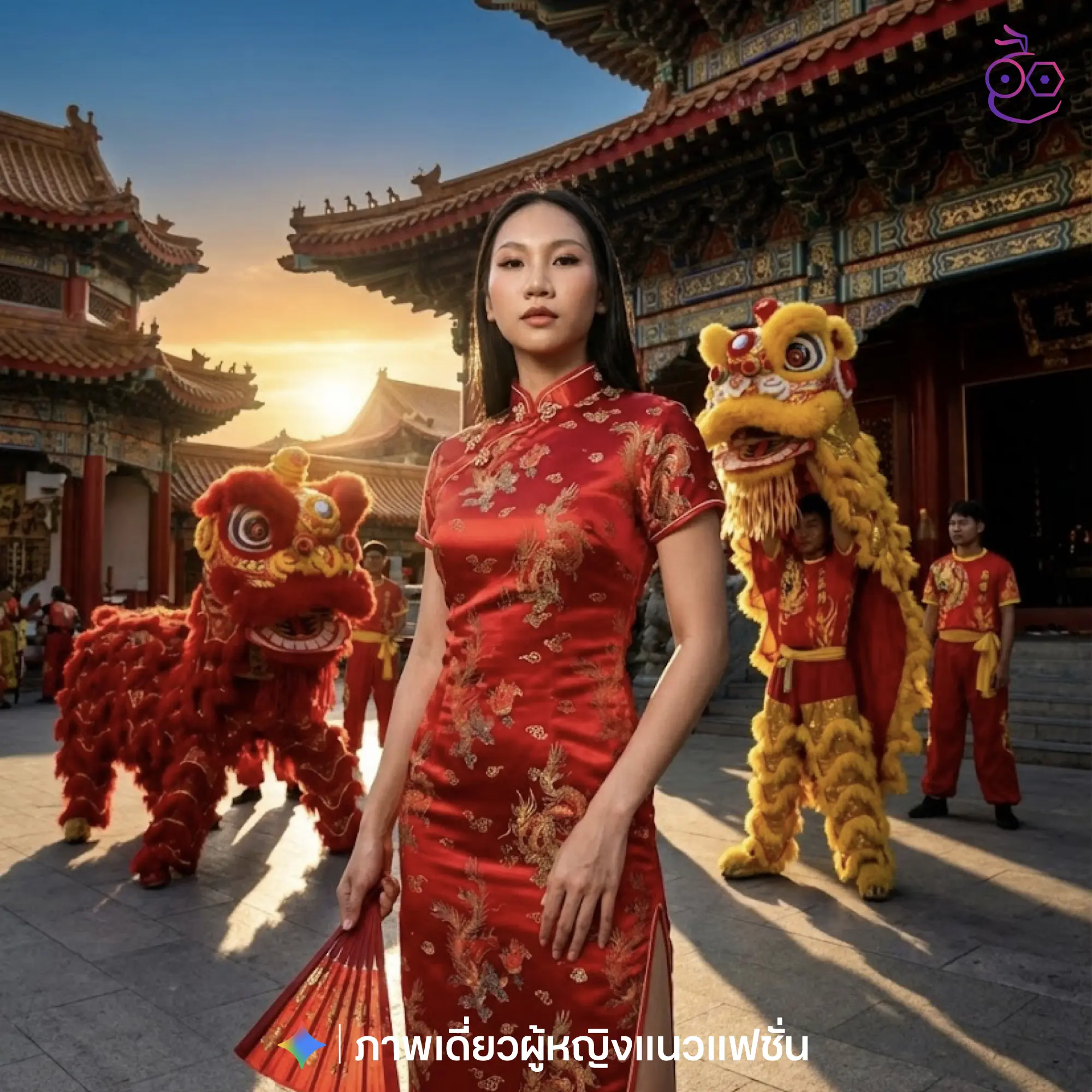สร้างภาพขนาด 4:5 โดยใช้ภาพที่อัปโหลดไว้เป็นภาพอ้างอิงโดยรักษาความเหมือนของใบหน้า และอัตลักษณ์เดิมไว้อย่างครบถ้วน ภาพถ่ายแฟชั่นมุมหันหน้าตรง นางแบบผู้หญิงยืนเต็มตัว หันหน้าตรง มองกล้องอย่างมั่นใจ สีหน้าสงบนิ่ง เท่ มีพลัง สวมชุดกี่เพ้าสีแดงลวดลายจีน ทรงเข้ารูป ผ่าข้าง ท่วงท่าสง่างาม มือข้างขวาถือพัดสีแดง แสดงความเป็นผู้นำ ฉากหลังเป็นศาลเจ้าจีนหรือสถาปัตยกรรมจีนโบราณ มีการแสดงเชิดสิงโตจีนอยู่ด้านหลัง เพิ่มพลังและบรรยากาศวัฒนธรรม โทนสีแดง ทอง ดำ ตัดกับท้องฟ้าและแสงธรรมชาติ แสงแดดตอนเย็นแบบซินีมาติก เงาคม คอนทราสต์ชัด ภาพคมชัด คุณภาพสูง สไตล์แฟชั่นเอดิตอเรียล