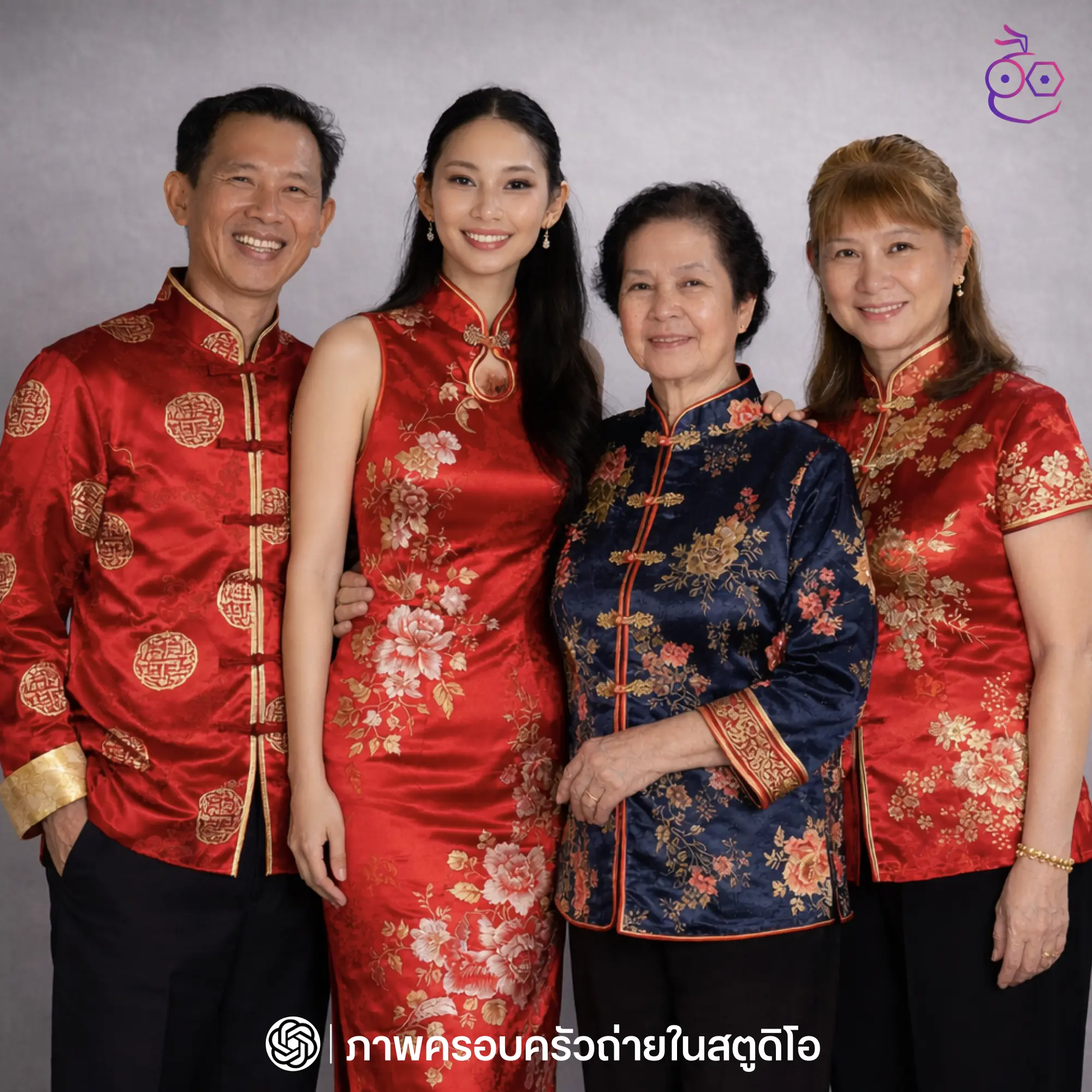 สร้างภาพขนาด 4:5 โดยใช้ภาพที่อัปโหลดไว้เป็นภาพอ้างอิงโดยรักษาความเหมือนของใบหน้า ภาพถ่ายพอร์ตเทรตครอบครัวธีมตรุษจีน สมาชิกครอบครัวยืนรวมกันเป็นกลุ่มอย่างอบอุ่น จัดตำแหน่งอย่างสมดุล ทุกคนหันหน้าตรง มองกล้อง ท่าทางสุภาพ เป็นทางการเล็กน้อย สวมชุดจีนดั้งเดิมและชุดจีนร่วมสมัย สีแดง แดงเข้ม น้ำเงิน ทอง ผ้าซาตินหรือผ้าไหม ลวดลายจีนแบบคลาสสิก ฉากหลังสีเทาเรียบ สไตล์สตูดิโอ ไม่มีลวดลาย แสงสตูดิโอนุ่ม กระจายทั่วภาพ ให้ผิวดูเรียบและอบอุ่น โทนภาพสุภาพ เป็นทางการ อบอุ่น เหมาะกับภาพครอบครัว ภาพคมชัดสูง สไตล์ studio family portrait