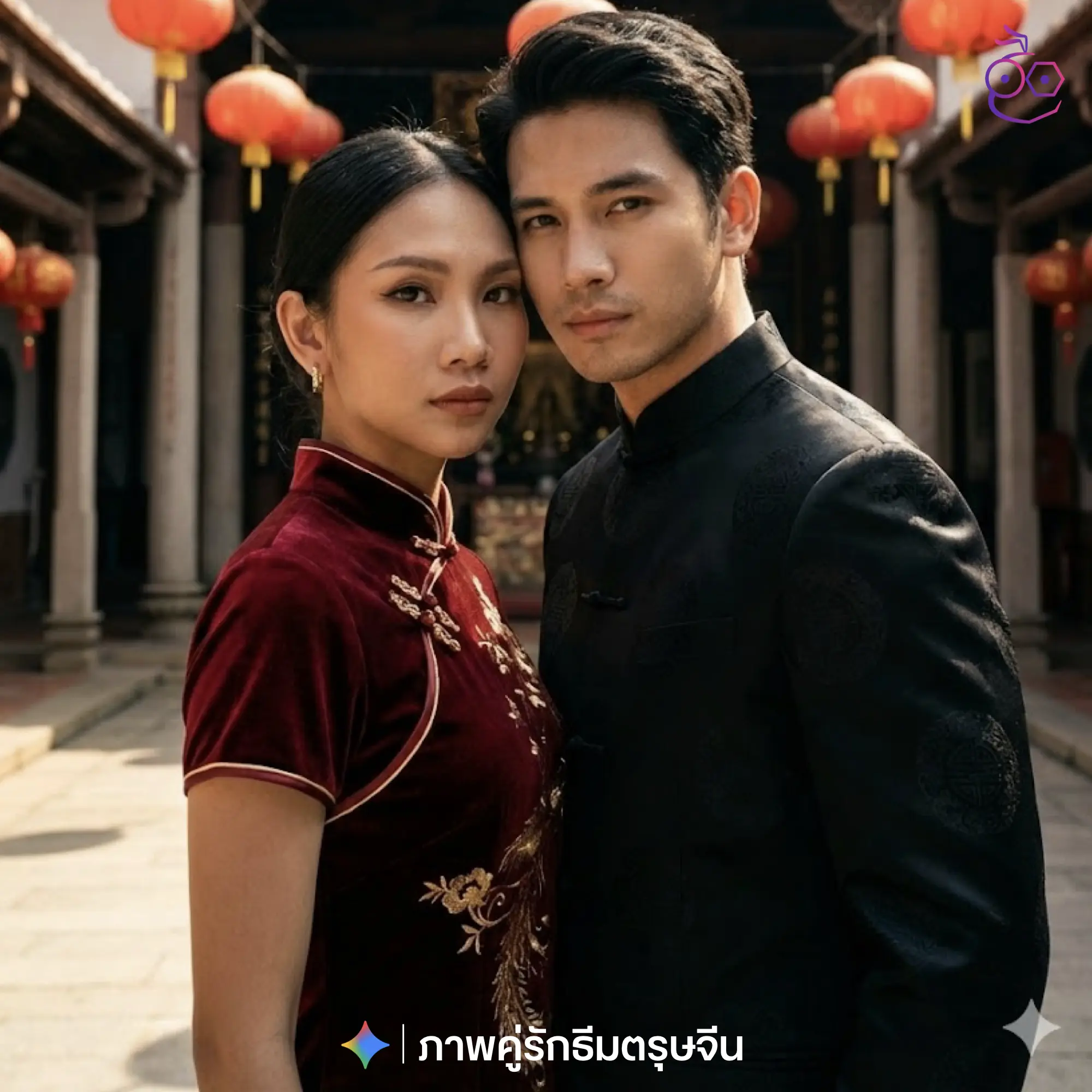 สร้างภาพขนาด 4:5 โดยใช้ภาพที่อัปโหลดไว้เป็นภาพอ้างอิงโดยรักษาความเหมือนของใบหน้า ภาพถ่ายคู่รักธีมตรุษจีน สไตล์เท่ สุขุม และทรงพลัง ชายและหญิงยืนอยู่ใกล้กัน ท่าทางมั่นใจ หน้าชิดเล็กน้อย ทั้งสองหันหน้าตรง มองกล้องอย่างนิ่ง เท่ มีเสน่ห์ ไม่ยิ้มหวาน แสดงความรักผ่านสายตาและท่าทาง ฝ่ายหญิงสวมชุดจีนหรือกี่เพ้าสีแดงเข้มหรือแดงกำมะหยี่ ฝ่ายชายสวมชุดจีนโมเดิร์นหรือสูทจีนสีดำหรือแดงเข้ม ทรงเสื้อเนี้ยบ หรู ดูร่วมสมัย ฉากหลังเป็นศาลเจ้าจีน สถาปัตยกรรมจีนดั้งเดิม มีโคมไฟจีนสีแดง แขวนเรียง เพิ่มบรรยากาศตรุษจีน โทนสีแดง ดำ ทอง หม่น ดูแพงและมีพลัง แสงธรรมชาติหรือแสงแดดแบบ cinematic เงาชัด คอนทราสต์สวย ภาพคมชัดสูง สไตล์แฟชั่นเอดิตอเรียล / โปสเตอร์หนังไม่มีตัวอักษร ไม่มีโลโก้