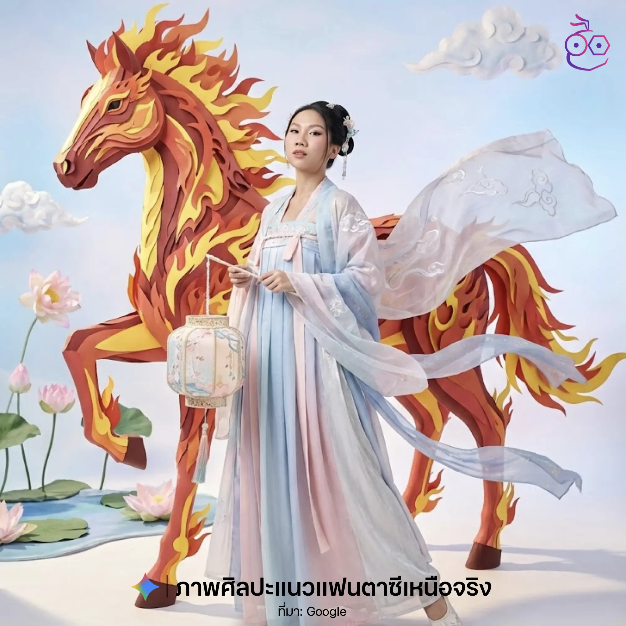 สร้างภาพขนาด 4:5 ภาพศิลปะแนวแฟนตาซีเหนือจริง (Surrealism) นางแบบสวมชุดแบบ จีน traditional แบบนางฟ้าWei Jin สมัยใหม่ ไล่เฉดสีพาสเทลฟ้าและชมพู ขาว เงิน การตัดเย็บแบบ Haute Couture ทรงผมเป็นแบบจีนเข้ากับชุด แนว Hanfu (Inner Layer + Outer Layer + Dress + Shawl + Sash) มีผ้ารัดเอว และผ้าคลุมไหล่ที่ลอยได้พริ้วๆมีผ้าพริ้วๆเหมือนเทพธิดาจีนรอบตัวท่าทางยืน (Stance): Power Stance โดยก้าวขาขวา (ด้านซ้ายของภาพ) มาข้างหน้าและเปิดปลายเท้าออก ทำให้ภาพดูมั่นคงแต่มีความเคลื่อนไหวการวางมือ (Hand Placement):วางแบบพริ้วๆธรรมชาติ มือหนึ่งถือโคมไฟจีนที่ตกแต่งแบบละเอียด สีเข้ากับชุดใบหน้าและสายตา (Face & Gaze): เชิดคางขึ้นเล็กน้อย สื่อถึงความหยิ่งผยอง (Haughty) ความมั่นใจ และความสง่างาม ยิ้มแย้ม สายตามองตรงมาที่กล้องอย่างดุดัน (Fierce)ม้าแบบสมจริง ทำมาจากวัสดุกระดาษหลายเลเยอร์สไตล์งานฝีมือ(Layered paper) โดยมีโทนสีแดง เหลือง ส้ม ตรงแผงคอและหางพริ้วๆเหมือนเฟลวไฟสีเหลือง ขาว การวางตำแหน่งม้า: ยืนขนานไปกับนางแบบ หันหน้าเข้ามาทางกล้องเล็กน้อย ทำให้ดูเหมือนเป็นเงาสะท้อนหรือคู่หูของนางแบบท่าทาง: ม้ายกขาหน้าขึ้นหนึ่งข้าง (คล้ายท่า Passé ในบัลเลต์ หรือกำลังก้าวเดิน) จังหวะนี้สำคัญมาก เพราะมันสร้างความรู้สึกว่าภาพนี้ “มีชีวิต” ไม่ใช่การยืนแข็งทื่อ และเส้นโค้งของคอม้าก็รับกับไหล่ของนางแบบพอดีฉันยืนอยู่ด้านหน้าม้า สายตามองกล้อง โพสต์ท่าแฟชั่นแบบเรียบๆ แต่ดูชั้นสูงฉากหลังเป็นท้องฟ้าไล่เฉดสีพาสเทล สีฟ้าและขาวตัดดูนุ่มนวล ให้ความรู้สึกเหมือนเทพนิยายและแฟชั่นชั้นสูงโดยภาพที่ได้เป็นภาพเหมือนถ่ายในสตูดิโอ แสงและเงาสมจริง, ฉันและม้าอยู่ตรงกลางภาพ เห็นเต็มตัวทั้งฉันและม้าและพื้น มีเงากระทบที่พื้นเล็กน้อย บางๆ ระดับกล้อง (Camera Level): เป็นมุมระดับสายตาหรือต่ำกว่าเล็กน้อย (Eye-level to Low Angle) ช่างภาพถ่ายเสยขึ้นเล็กน้อยเพื่อทำให้ตัวนางแบบและม้าดูสูงสง่า ทรงพลังรอบๆรอบมีของตกแต่งโดยมีแสงเงาเหมือนจริง ของตกแต่งมีเท็กเจอร์เป็นผ้า โดยมี ดอกบัว ใบบัว สระน้ำ เมฆ ผิวของฉันและม้าเหมือนมีตัวตนจริงๆ ไม่ดูเหมือน ai