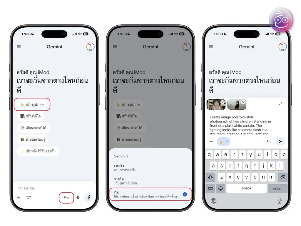 เข้ามาที่ Gemini > เลือกเครื่องมือ “สร้างรูปภาพ” (ไอคอนกล้วย) > เลือกโมเดล Pro > อัปโหลดรูป จากนั้นเขียน Prompt > กด Generate