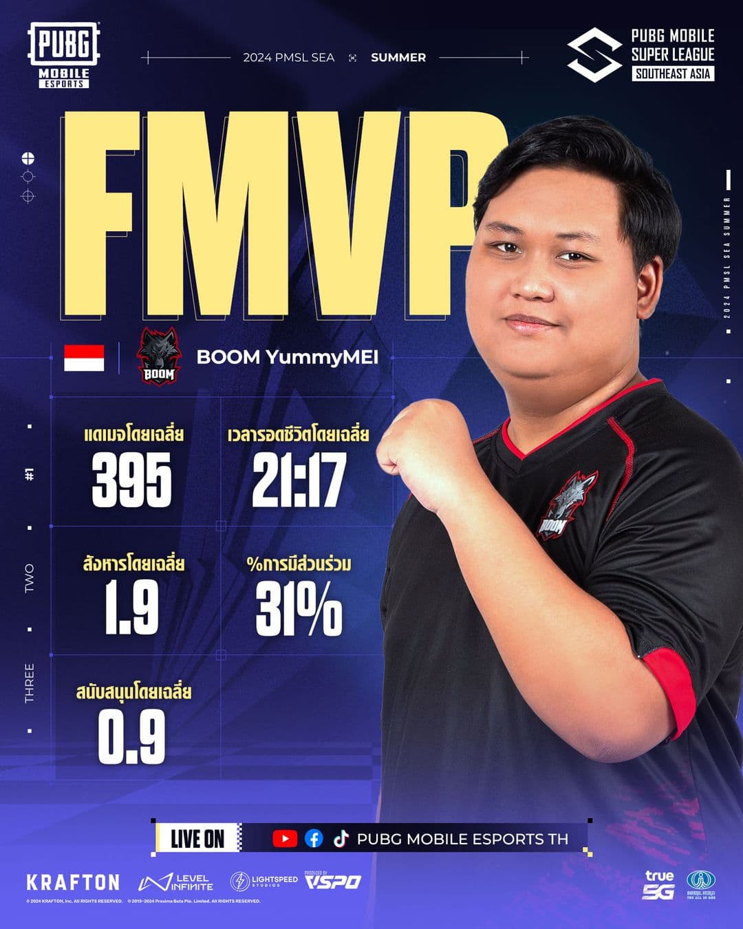 BOOM YummyMEI ผู้เล่นทรงคุณค่าประจำรอบชิงชนะเลิศหรือ FMVP ก็ตกไปเป็นของแชมป์อย่างทีม Boom Esports โดยเจ้าตัวนั้นได้โชว์ฟอร์มเทพ พร้อมทั้งสถิติสุดโดดเด่น ไม่ว่าจะเป็นการทำแดเมจ เวลารอดชีวิต การสนับสนุน หรือการมีส่วนร่วมกับทีม รางวัลนี้จึงตกไปอยู่กับเจ้าตัว