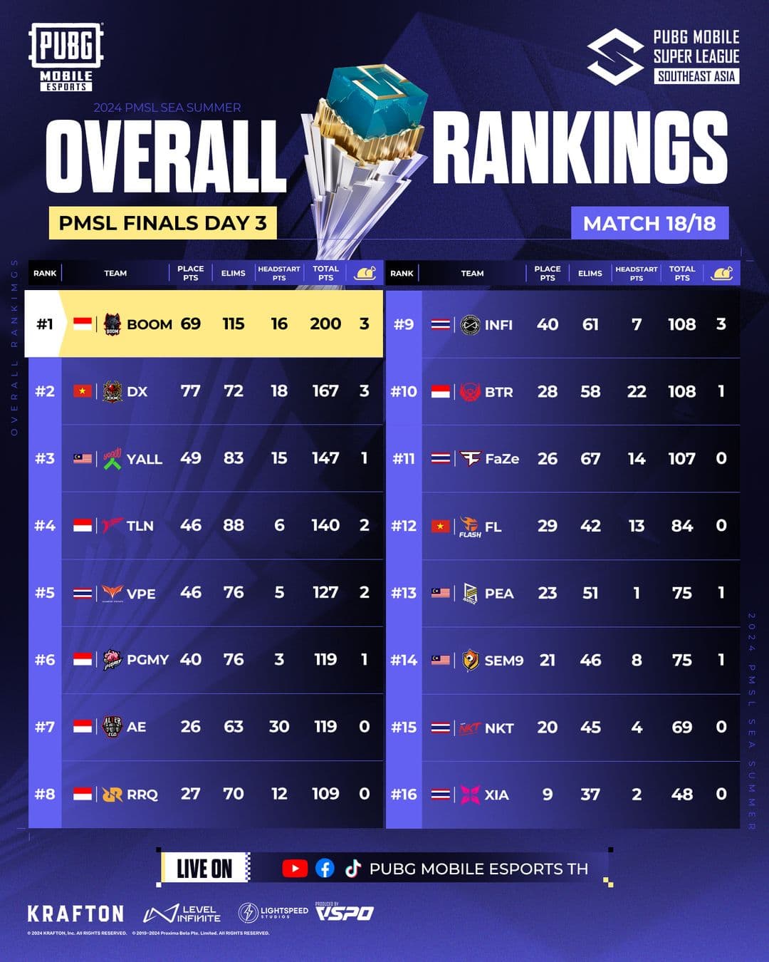 Boom Esport ทีมตัวแทนจากประเทศอินโดนีเซีย ผงาดโชว์ฟอร์มสุดยอดเยี่ยมคว้าบัลลังก์แชมป์ประจำฤดูกาล Summer ไปได้สำเร็จพร้อมคว้าตั๋วไปแข่งต่อในรายการ PUBG Mobile World Cup