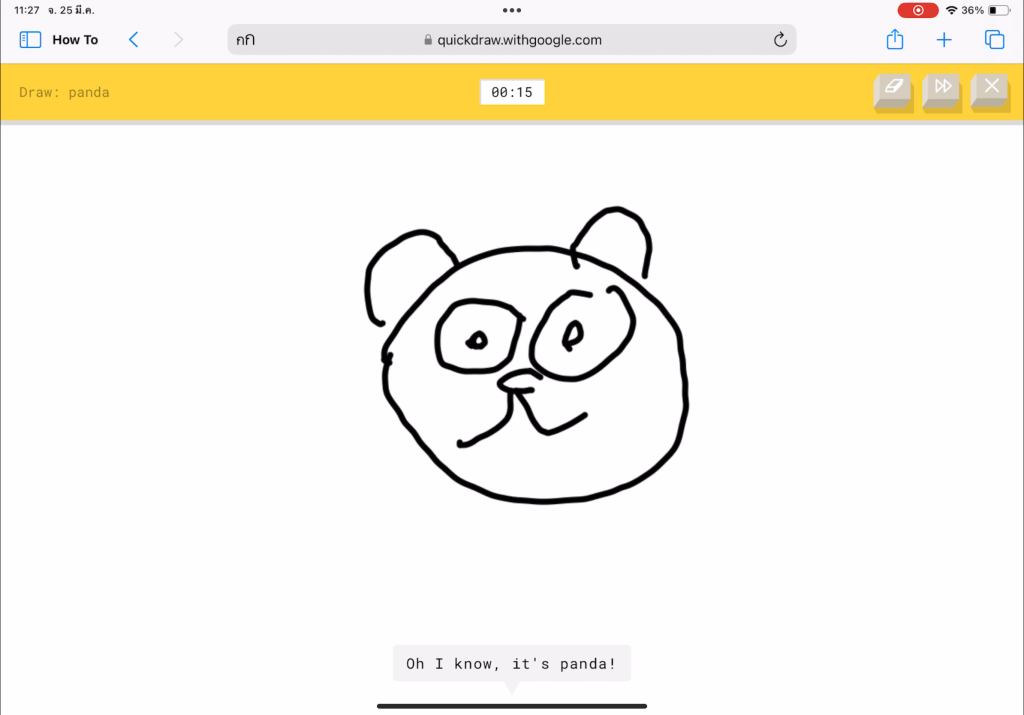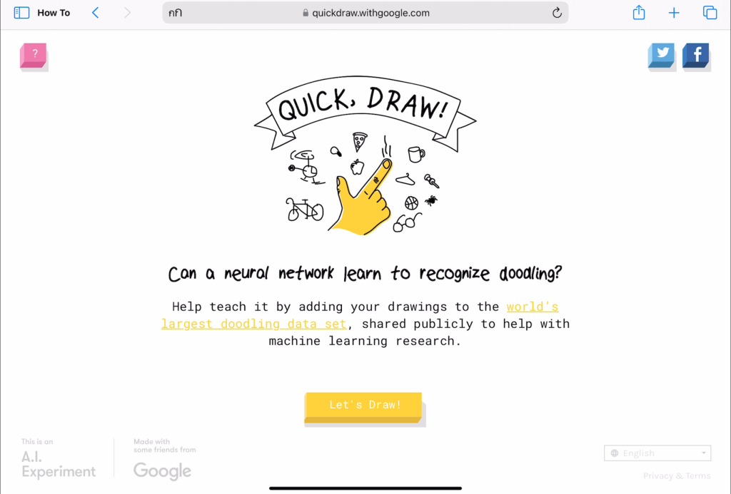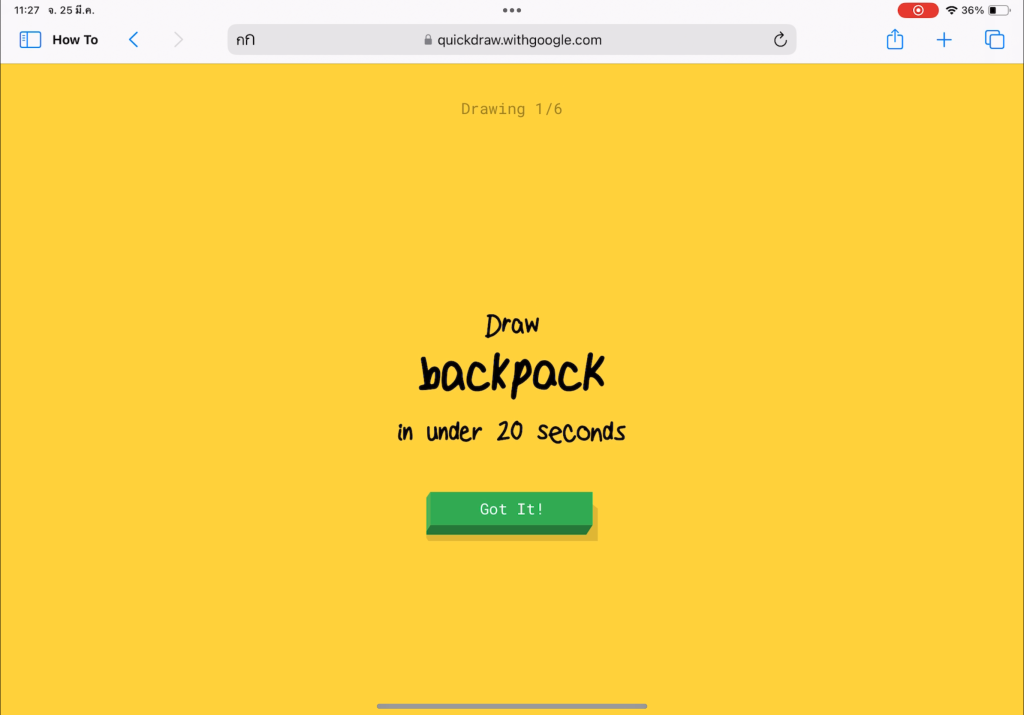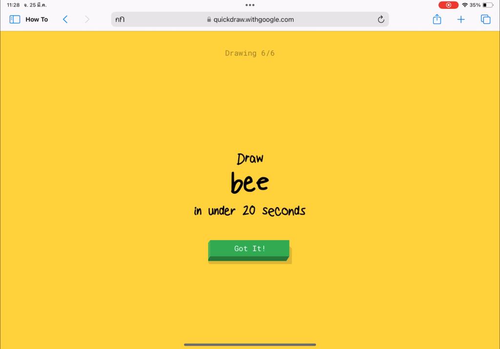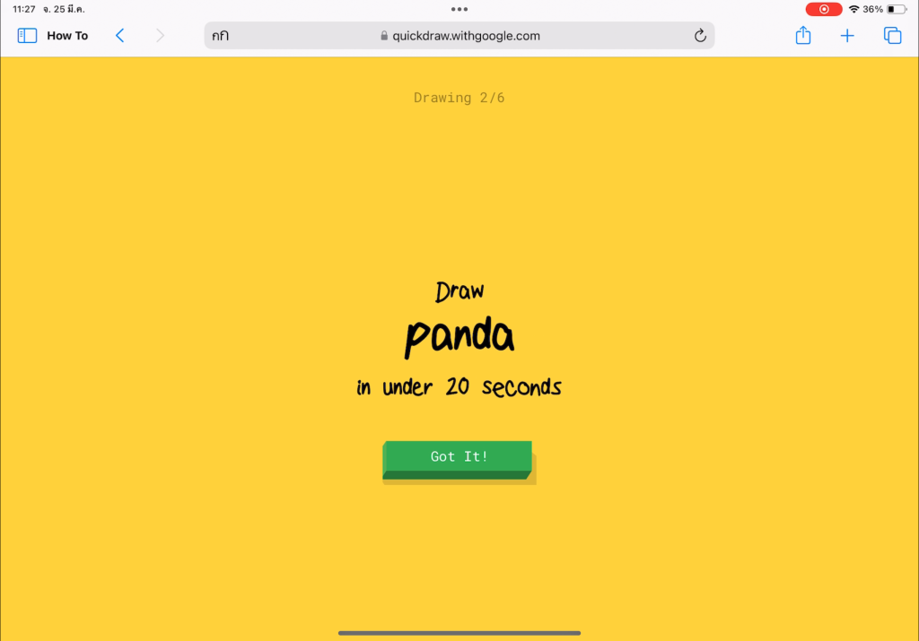 ไปที่เว็บไซต์ Quickdraw > กดเริ่มวาดรูป ” Let’s Draw!” > เริ่มวาดรูปตามโจทย์ให้เสร็จโดยมีเวลาวาดเพียง 20 วินาที
