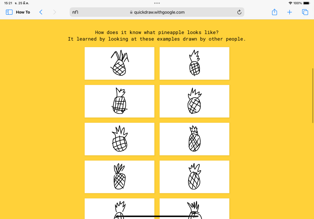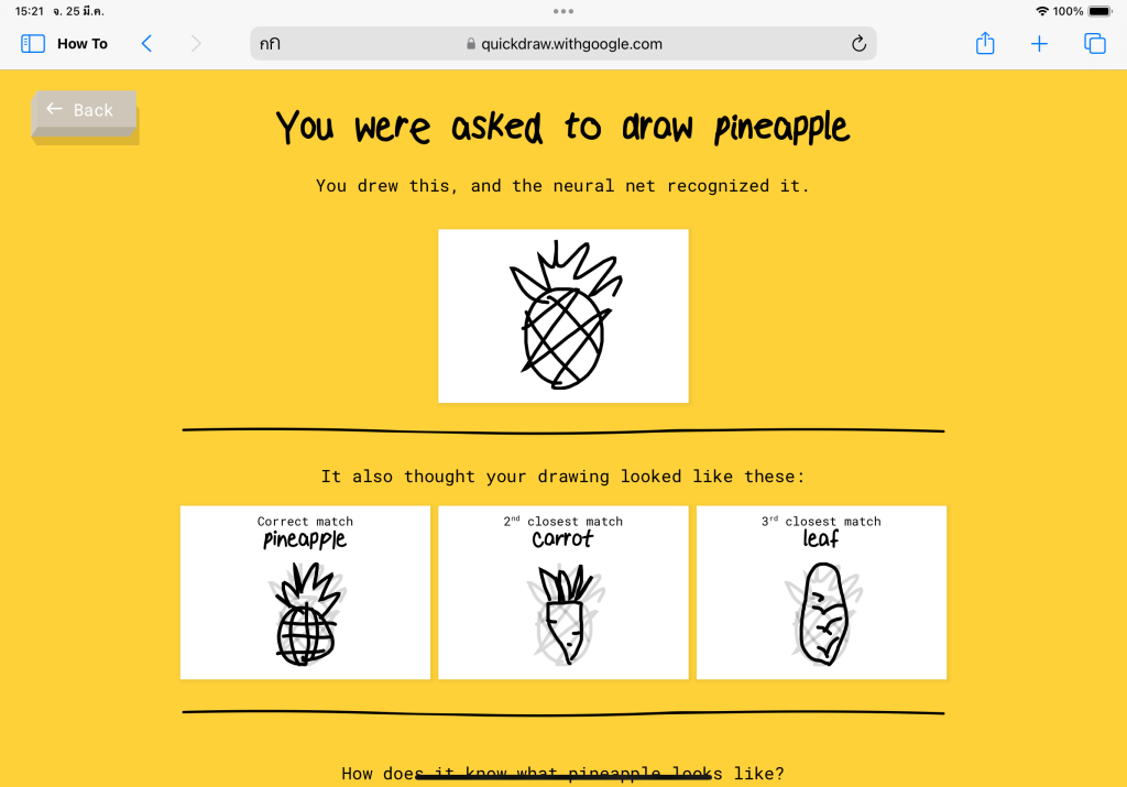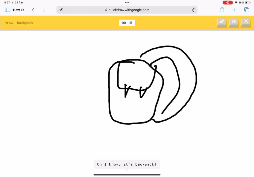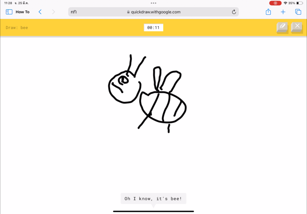 ไปที่เว็บไซต์ Quickdraw > กดเริ่มวาดรูป ” Let’s Draw!” > เริ่มวาดรูปตามโจทย์ให้เสร็จโดยมีเวลาวาดเพียง 20 วินาที