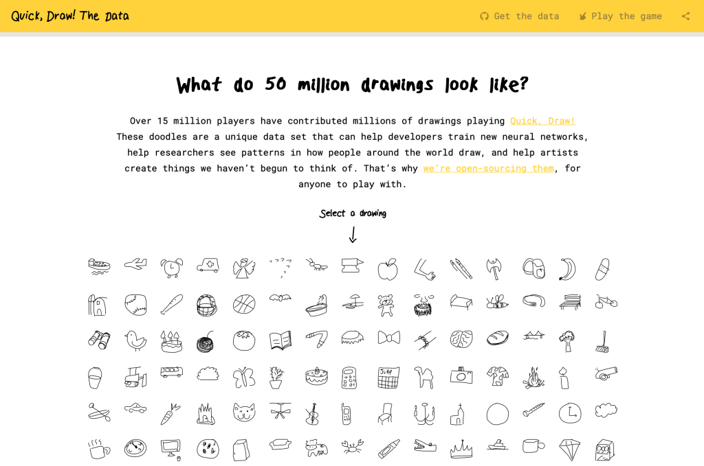 เราสามารถชมผลงานของของผู้เล่นกว่า 15 ล้านคนได้ เพื่อนๆที่เล่น Quick, Draw! จะมีส่วนร่วมในการวาดภาพเหล่านี้ ทางเว็บจะเก็บเป็นชุดข้อมูลที่ไม่เหมือนซึ่งสามารถช่วยให้นักพัฒนาฝึกวาดภาพ และฝึกภาษา อีกทั้งยังช่วยให้นักวิจัยหลายๆคนได้เห็นรูปแบบในวิธีการวาดที่ผู้คนทั่วโลกกำลังลงมือวาด