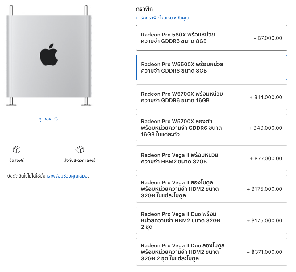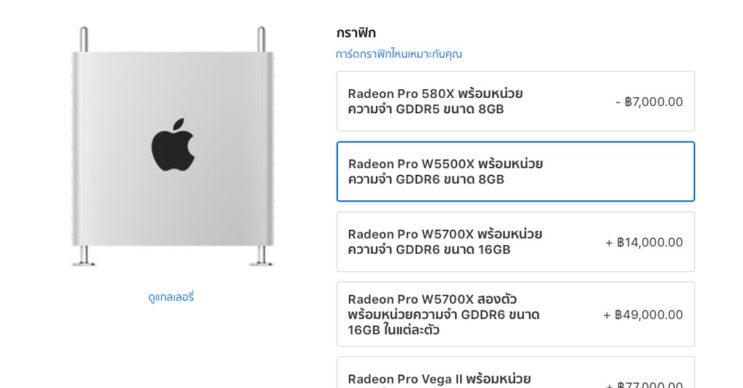 ลูกค้าสามารถเลือกกราฟิก Radeon Pro W5500X พร้อมหน่วยความจำ GDDR6 ขนาด 8GB สำหรับซื้อ Mac Pro แบบปรับแต่งได้แล้ว จ่ายเพิ่มอีก 7,000 บาท