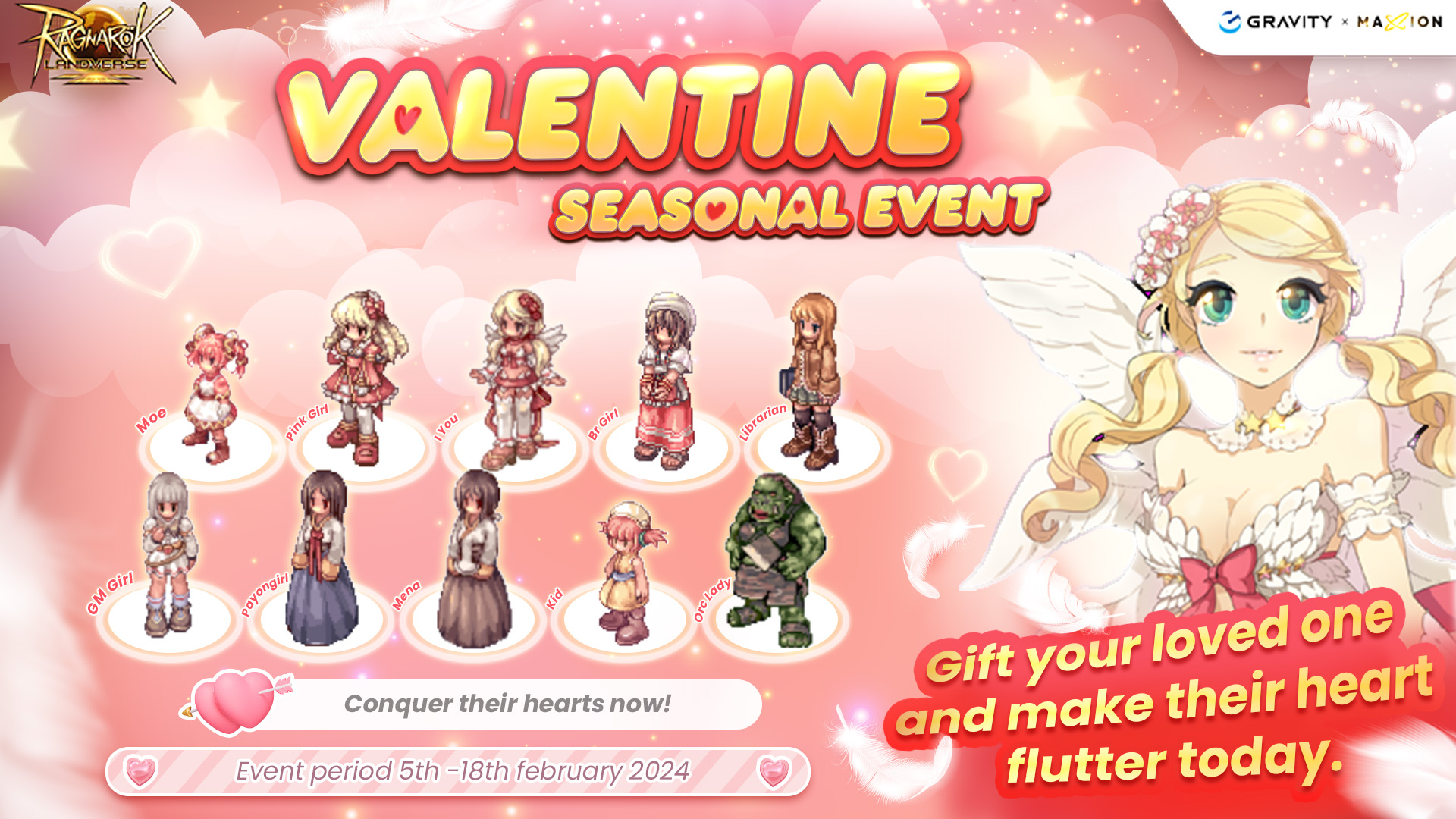 Valentine seasonal event ของเกม Ragnarok Landverse เริ่มตั้งแต่ 5-18 ก.พ. 2566 ซื้อของขวัญไปแจก NPC สาวในเกม รับ Lovely Heart เพื่อเอาไปแลกของรางวัลเพิ่มเติมได้!