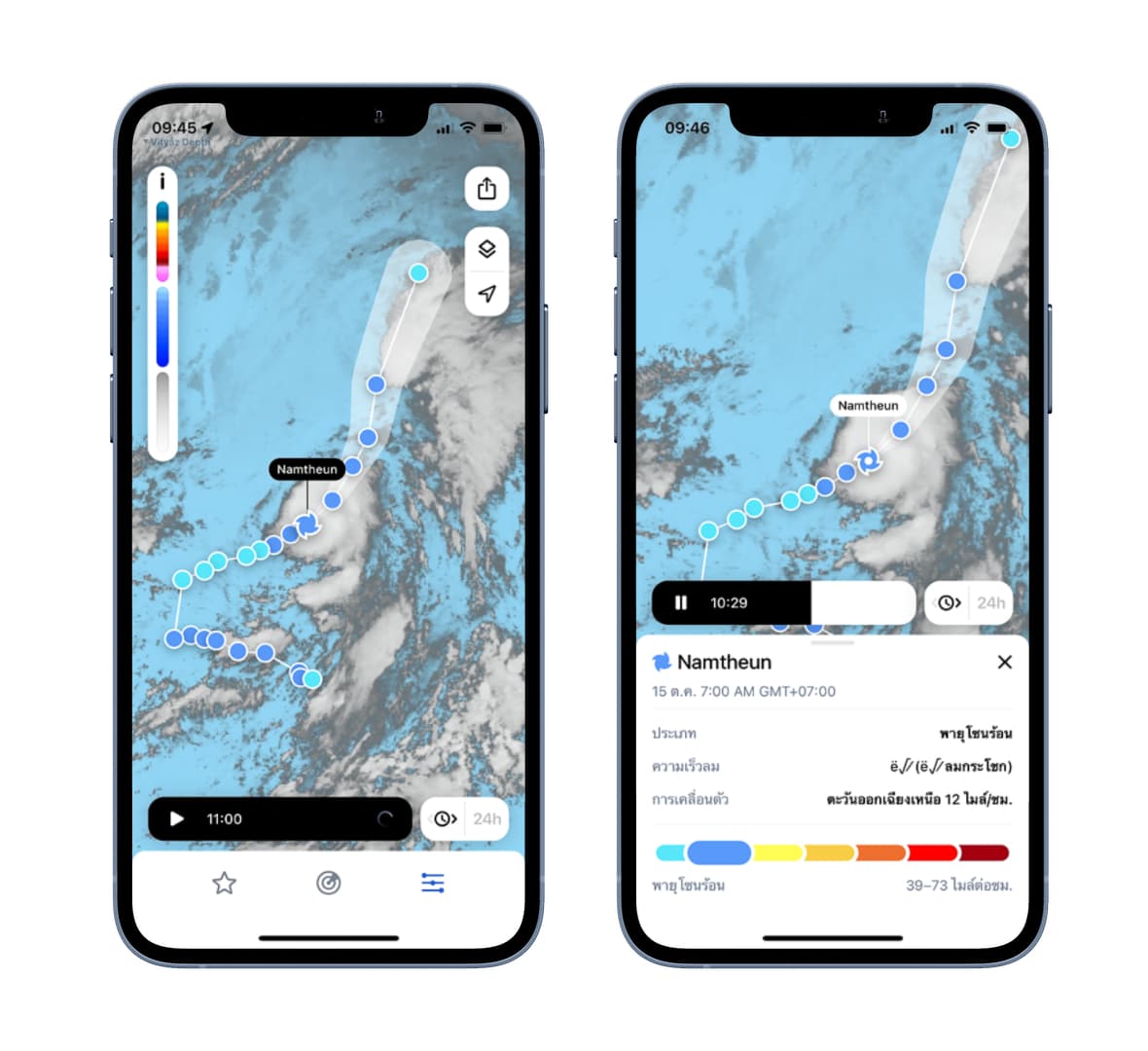 โดยแผนที่สภาพอากาศภายในแอปก็จะแสดงทิศทางของพายุ บอกประเภทของพายุนั้น บอกความเร็วและทิศทางการเคลื่อนตัวอย่างละเอียด