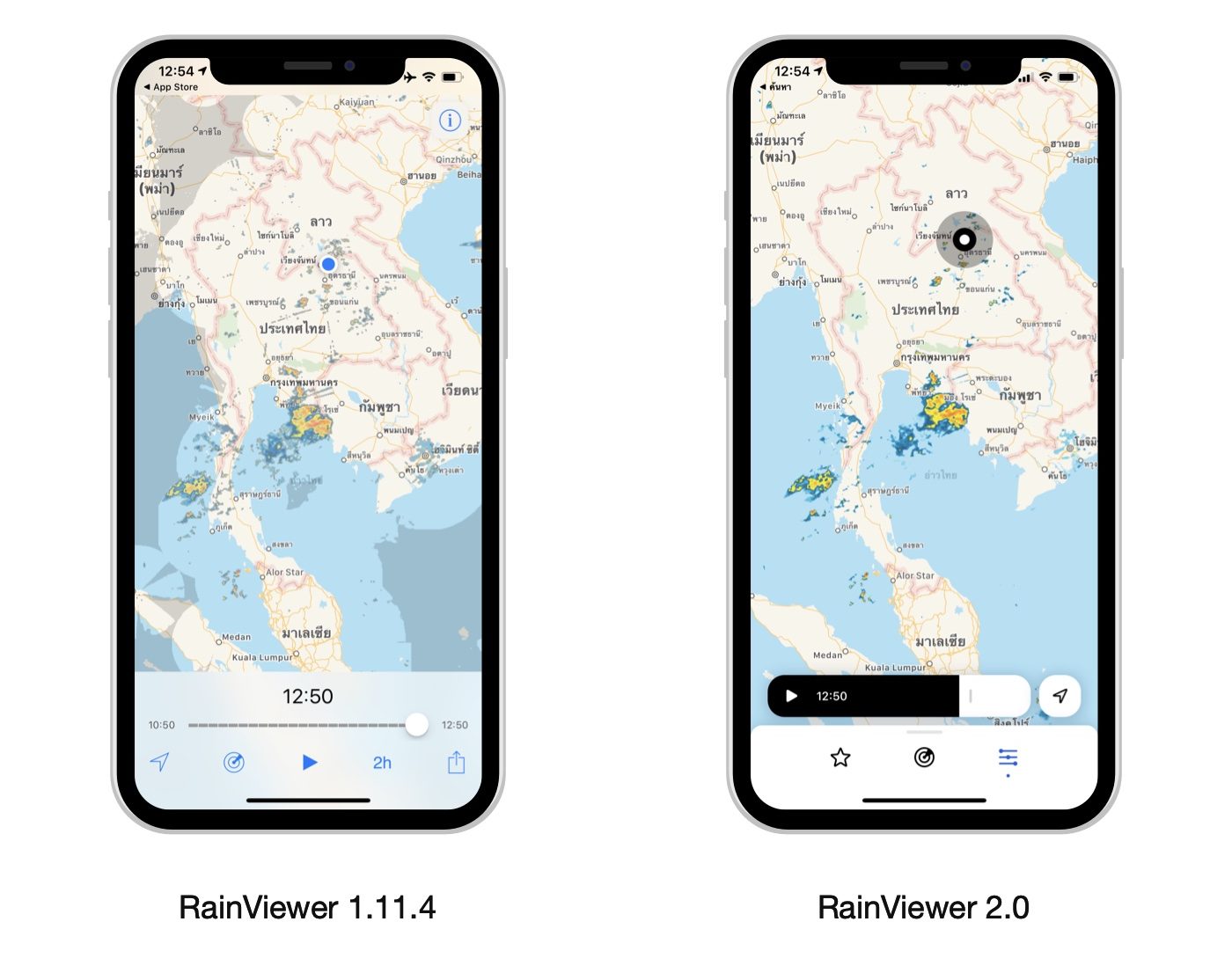 ใน RainViewer 2.0 นี้มีการเปลี่ยนแปลงหลายจุดโดยเฉพาะอย่างยิ่งคือ UI ของแอปรูปแบบใหม่ที่ดูทันสมัยมากกว่าเดิมพร้อมกับการแสดงข้อมูลที่เร็วขึ้นและลื่นไหลมากกว่าเดิมถึง 2 เท่า ทั้งนี้ RainViewer 2 ยังรองรับ Dark Mode อีกด้วย