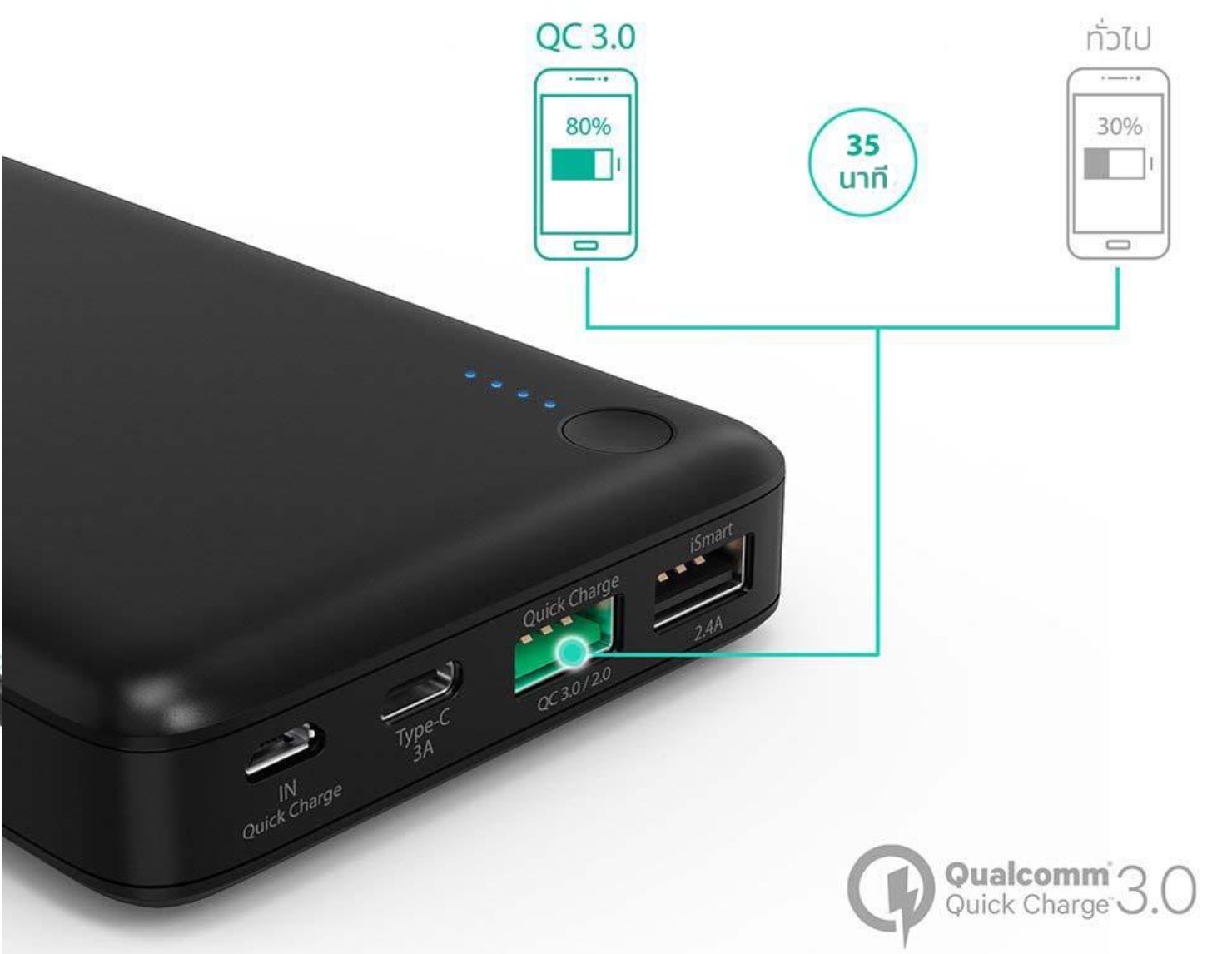 - Micro USB สำหรับชาร์จไฟเข้าแบตสำรอง รองรับ Quick Charge 3.0 ชาร์จเต็มภายใน 4.5 ชั่วโมงเมื่อใช้งานร่วมกับ Adapter ที่มาพร้อม Quick Charge 3.0