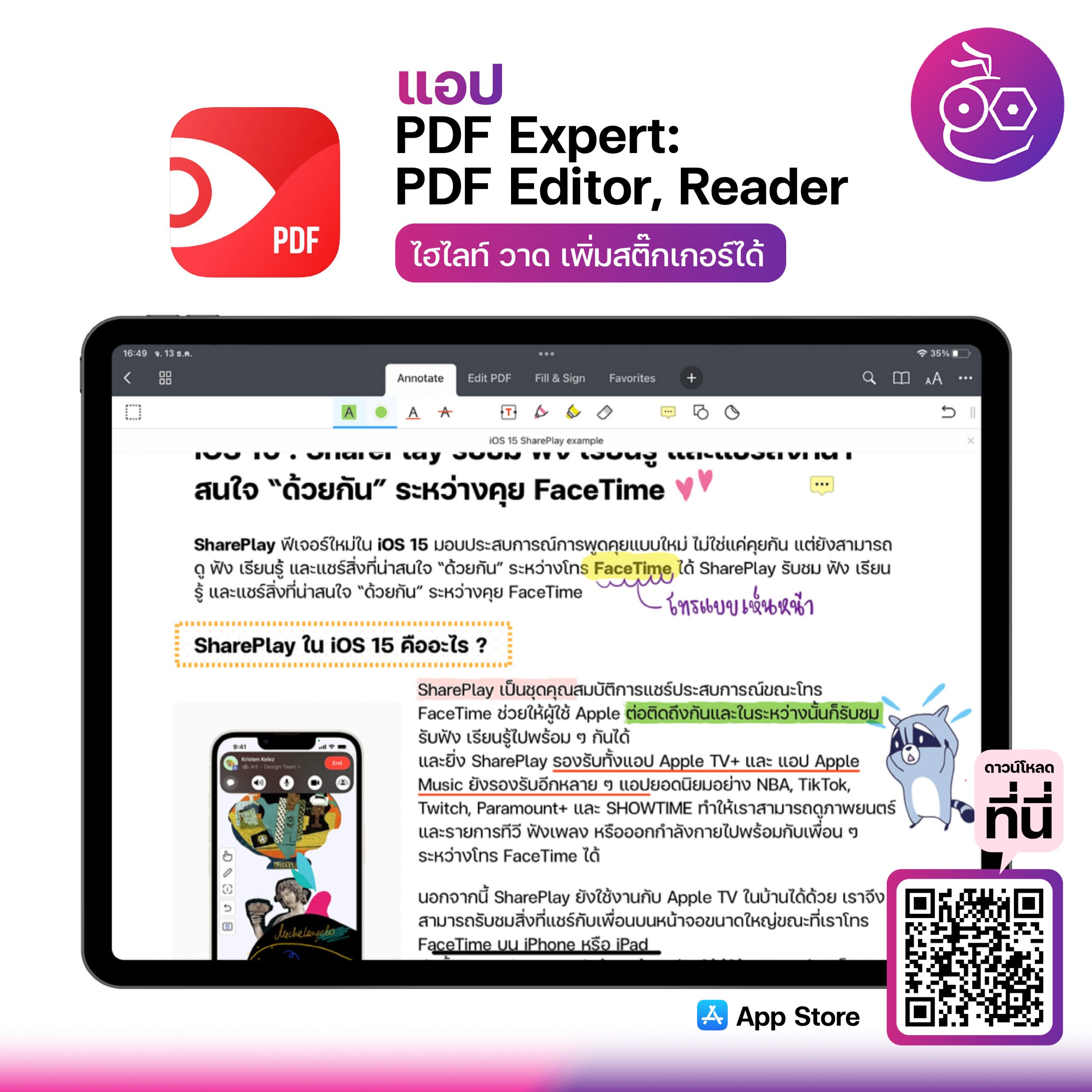 แอป PDF Expert เป็นแอปอ่าน PDF ที่สะดวกครบครันมาก เพราะสามารถไฮไลท์ข้อความ ขีดเส้นใต้ เพิ่ม Text สามารถขีดเขียนลงบน PDF หรือจะเพิ่มโน้ต เพิ่มรูปร่างเลขาคณิต เช่น สี่เหลี่ยม วงกลม นอกจากนั้นยังมีสติ๊กเกอร์ภายในแอป ทำให้เราสามารถเพิ่มความน่าอ่านของ PDF ได้มากขึ้นเลยทีเดียว