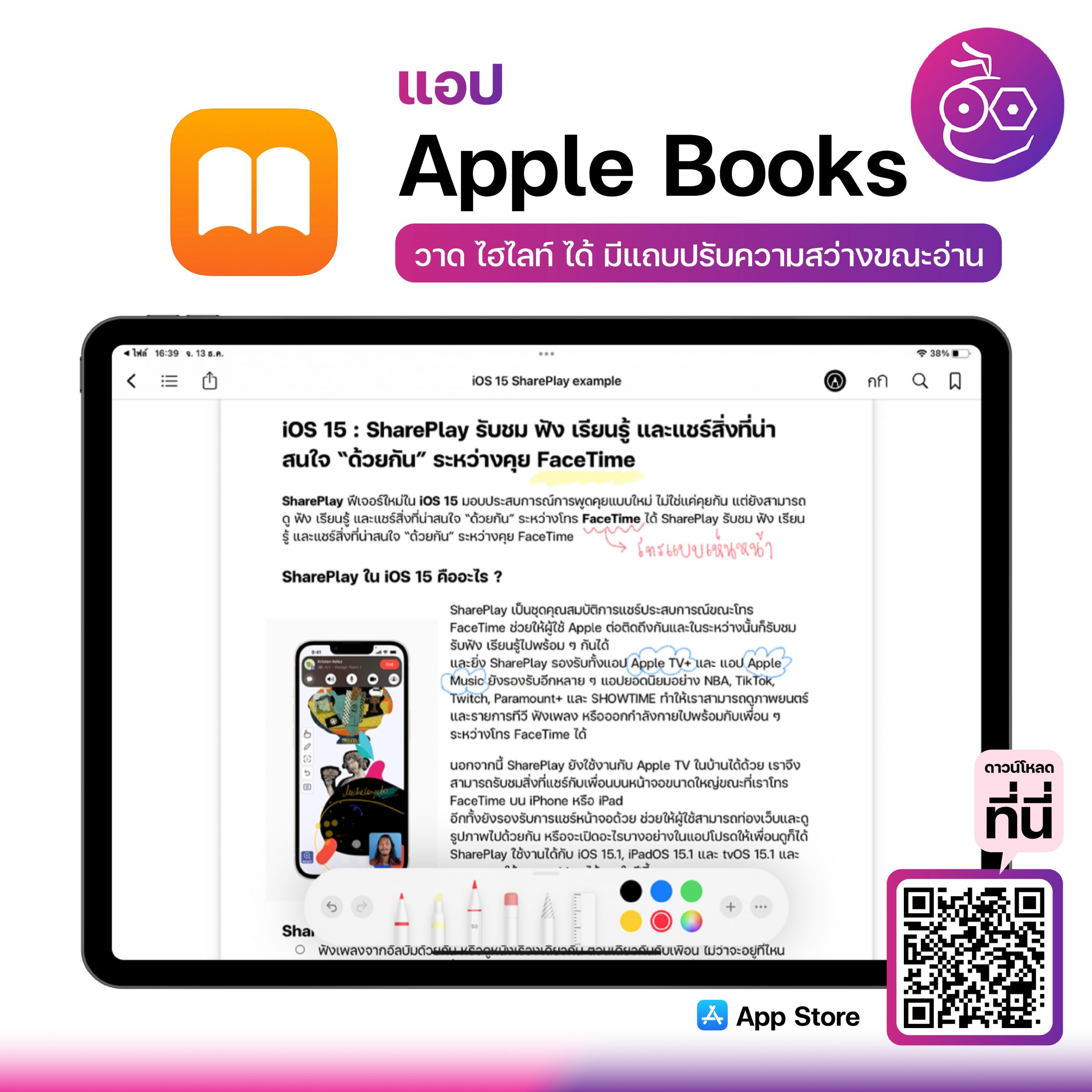 แอปหนังสือหรือแอป Books เป็นแอปที่มีอยู่ใน iPhone, iPad อยู่แล้ว ซึ่งแอปหนังสือสามารถเปิดเอกสาร PDF ได้ มีแถบเครื่องมือ สามารถเลือกหัวบรัช ขนาด และสีของบรัช และขีดเขียนหรือไฮไลท์ลงบน PDF ได้ มีแถบเครื่องมือที่สามารถปรับความสว่างของหน้าจอทำให้เราสะดวกต่อการอ่าน และมีปุ่มเสริตหาข้อความอีกด้วย