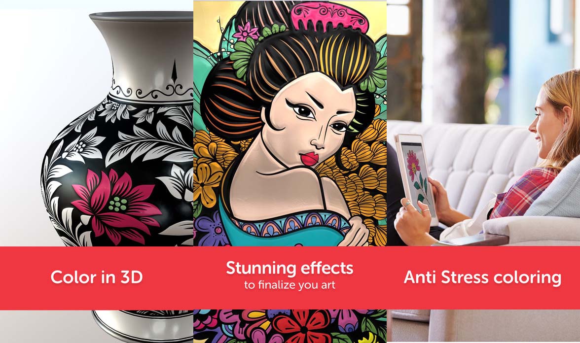 • ภาพสวยกว่า 1,000 ภาพ ให้ระบาย เช่น ภาพ Mandalas, ภาพสัตว์ ,ภาพ Bouquets, ภาพอัญมณี, ภาพ Lowpolys, ภาพ Mortes, ภาพ 3D และอื่น ๆ อีกมากมาย พร้อมอัปเดตภาพใหม่ทุกวัน (บางภาพอาจมีการซื้อเพิ่มเติมภายในแอป)