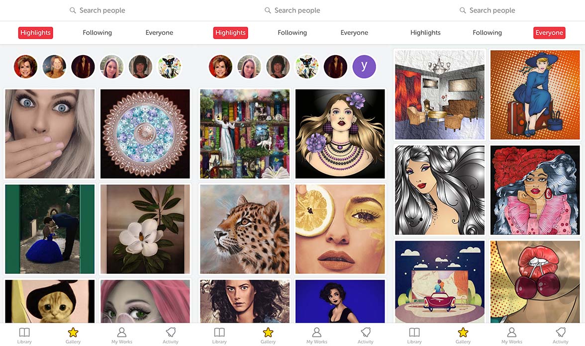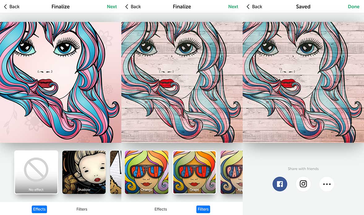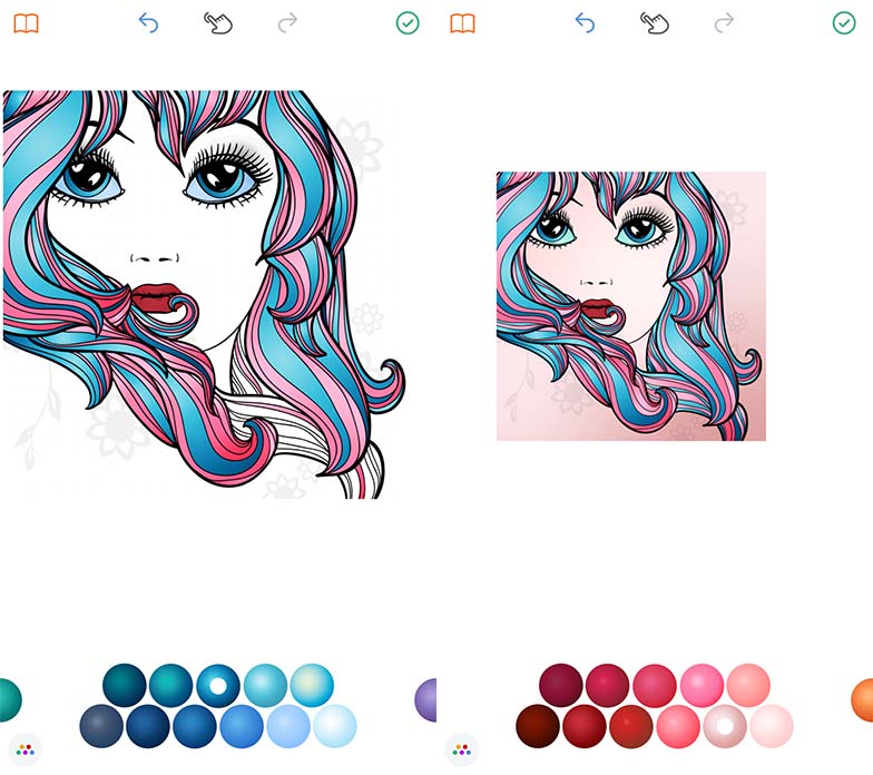 • สีที่มีให้ระบายครบทุกเฉดสี ได้แก่ สีแบบ Gradients, Solid Colors, Live Colors, Recolor Palettes, Crayons และสีแบบกำหนดเอง (บางสีอาจมีการซื้อเพิ่มเติมภายในแอป)