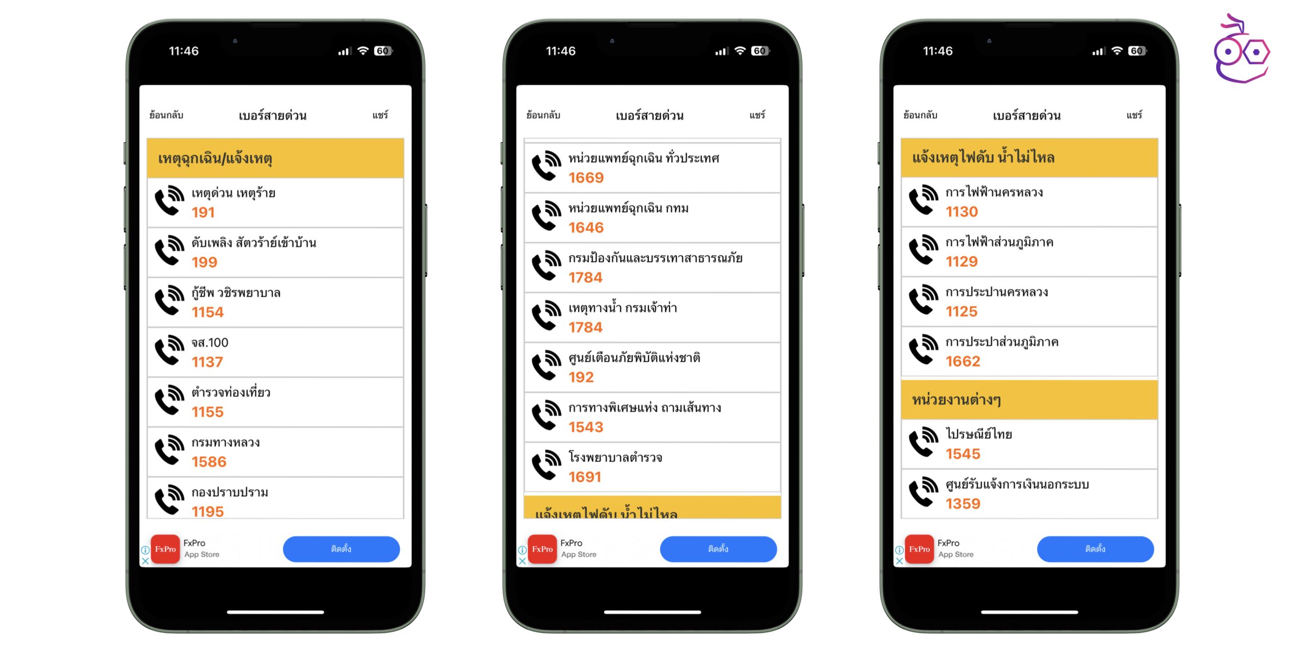 สำหรับใครที่ไม่ต้องการจดหมายเลข การติดต่อเหตุฉุกเฉินต่าง ๆ แอปนี้ได้รวบรวมหมายเลขเอาไว้ให้เราแล้ว ถือว่าเป็นข้อมูลที่ติดตัวไว้ ก็ไม่เสียหาย (เราสามารถกดที่เบอร์ติดต่อแล้วโทรออกได้เลย)