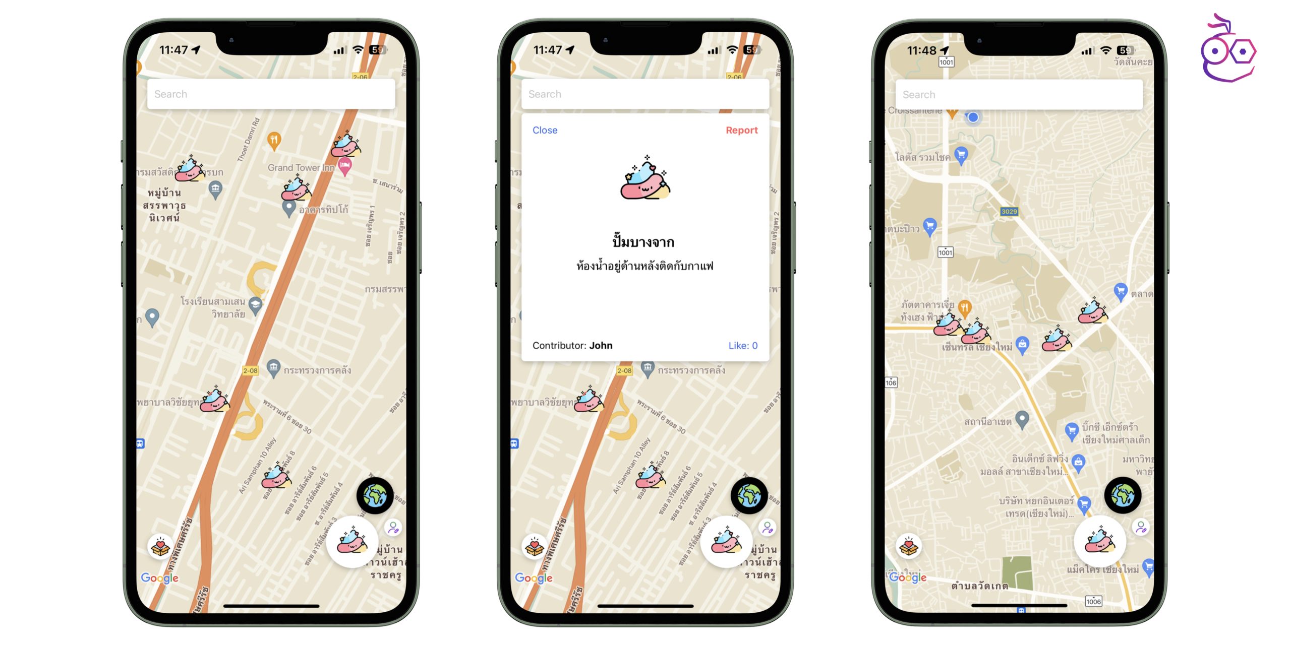 แอปที่แสดงข้อมูลให้เราเห็นว่า มีห้องน้ำใกล้ๆ เราในแผนที่ตรงไหนบ้าง เหมาะมากเวลาที่ไปต่างจังหวัด หรือ สถานที่ที่เราไม่คุ้นเคย ตอบโจทย์ปัญหา ปวดห้องน้ำเวลาเดินทางได้เป็นอย่างดี และเรายังสามารถปักหมุด เพิ่มสถานที่ห้องน้ำ เพื่อช่วยเหลือเพื่อน ๆ ของเราให้ทราบว่ามีห้องน้ำอยู่ใกล้ๆ ได้อีกด้วย