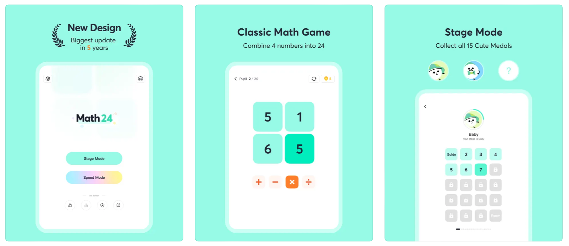 แอปตัวนี้มี 2 โหมดให้เราเลือกเล่นได้แก่ Stage Mode และ Speed Mode เกมนี้จะให้เราทำการเลือกเครื่องหมายทางคณิตศาตร์ บวก, ลบ, คูณ, หาร ในการทำให้ตัวเลข 4 ตัวรวมกันให้เป็น เลข 24 ให้ได้