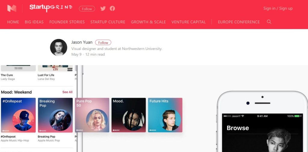 จุดที่ Jason Yuan พูดถึงการออกแบบแอป Apple Music ของ Apple ณ ตอนนี้ บางจุดยังให้ประสบการณ์การใช้งาน (UX : User Experience) ที่ยังไม่ครอบคลุมมากพอ และเหล่าบรรดานักออกแบบก็ต่างมาให้คำชื่นชมกับงานออกแบบของ Jason Yuan ว่าทำได้ดีและสวยงามมาก สามารถชมภาพและแนวคิดการออกแบบของแอป Apple Music โดย Jason Yuan เพิ่มเติมได้ที่ Start Up Grind – Jason Yuan