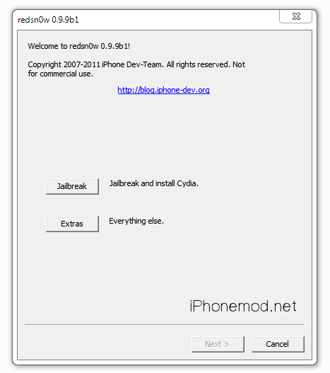 ความใหม่ของ redsn0w 0.9.9b1 ตัวนี้คือหลังจากที่รันโปรแกรมขึ้นมาจะมีให้เลือกอยู่ 2 ปุ่มคือ Jailbreak และ Extra