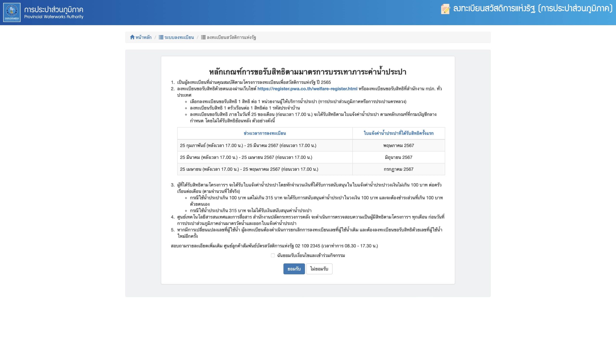 - ลงทะเบียนขอรับสิทธิ ภายในวันที่ 25 ของเดือน (ก่อนเวลา 17.00 น.) จะได้รับสิทธิตามใบแจ้งค่าน้ำประปา และจะไม่ได้รับสิทธิย้อนหลัง