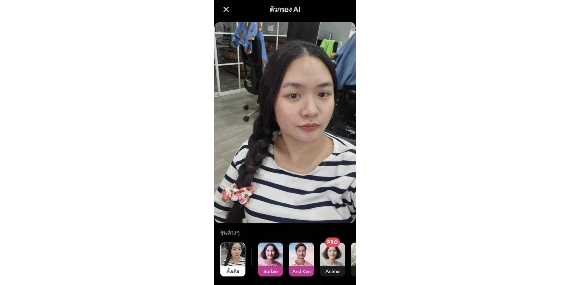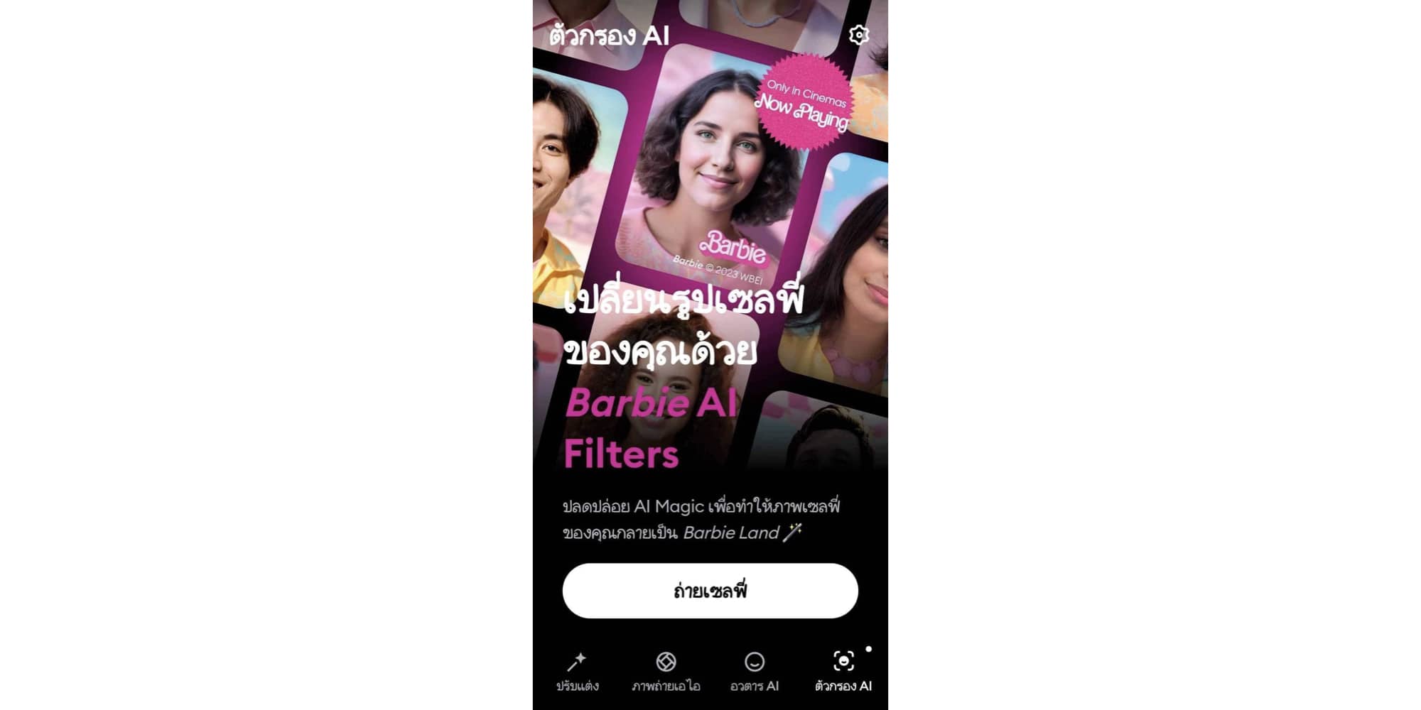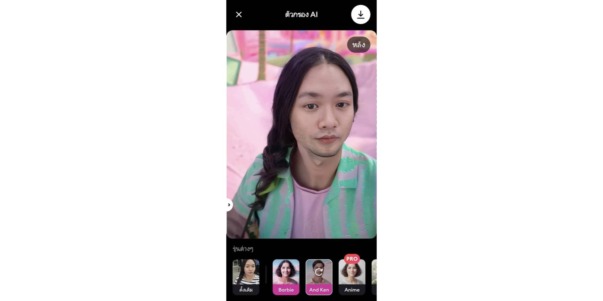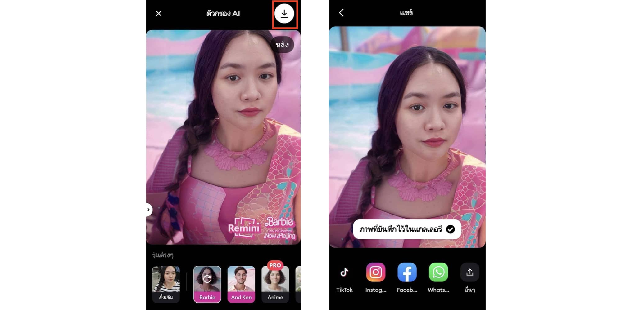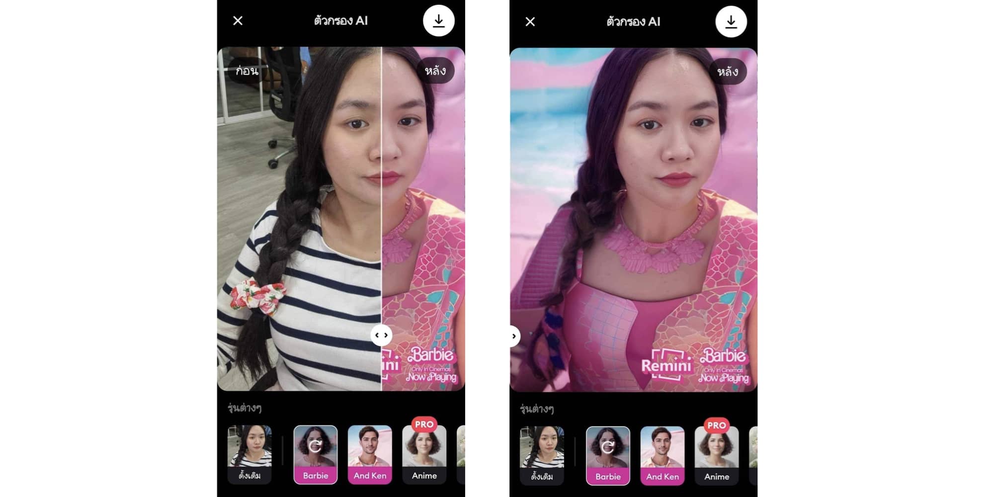 แล้วเลือกบาร์บี้ พอประมวลผลเสร็จ AI จะเปลี่ยนพื้นหลังและเสื้อผ้าของเรา เป็นบาร์บี้ในทันที นอกจากนี้ยังดูรูปก่อนกับหลังได้อีกด้วย