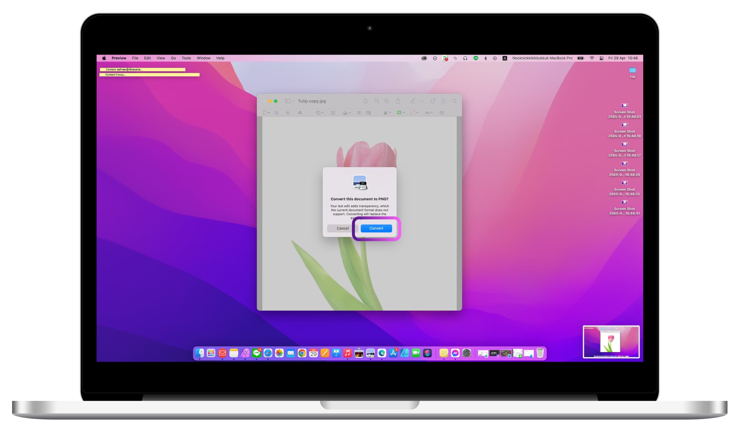 6.จากนั้นจะมีหน้าต่างเด้งขึ้นมาว่าต้องการจะแปลงรูปภาพเป็น PNG หรือไม่ ? เลือกกด “Convert”