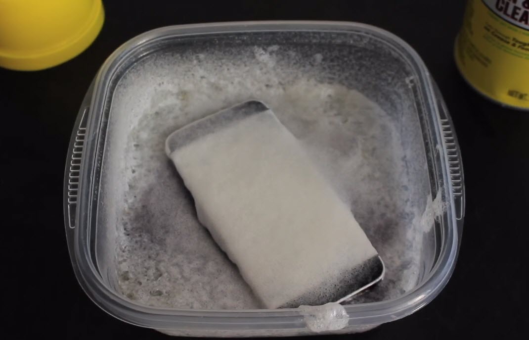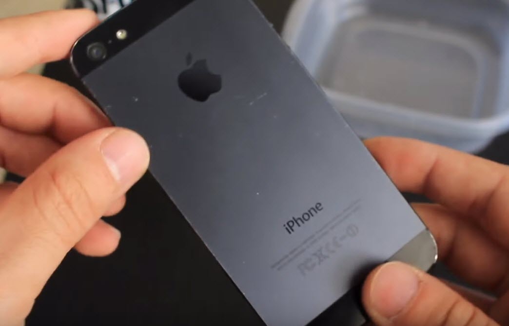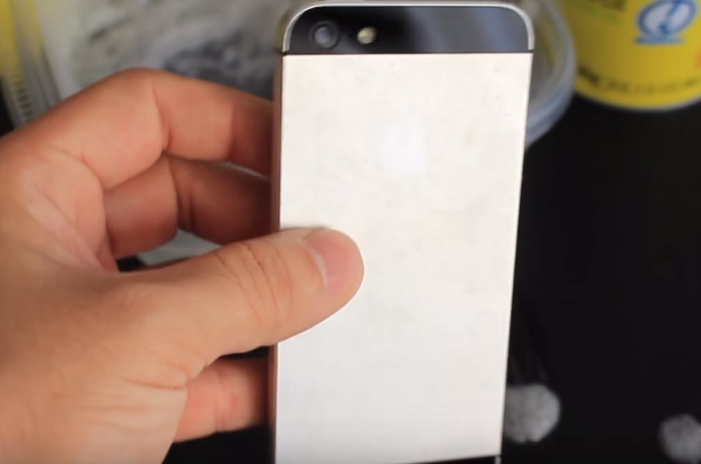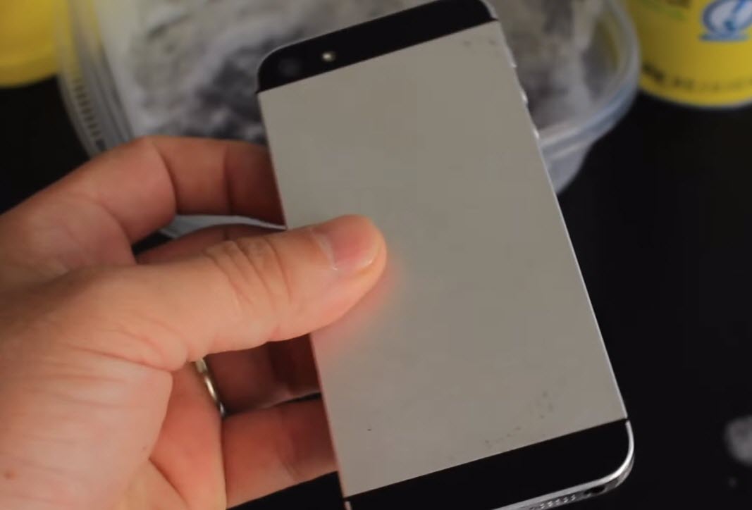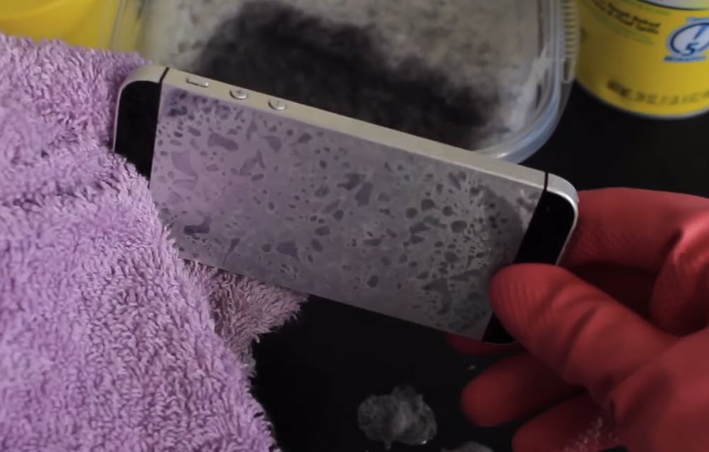 iDeviceHelp ได้ทดลองนำสเปรย์ขัดคราบเตาแก็ส เตาอบ มาฉีดลงบนกะละมังแล้วนำ iPhone 5 เครื่องเก่าของเขาไปแช่ เพื่อให้น้ำยาในสเปรย์ทำปฏิกริยากัดสีของ iPhone 5 ออก