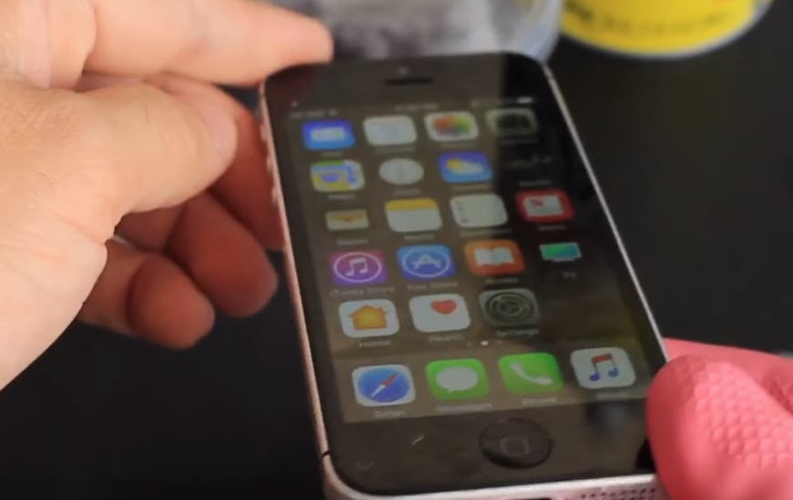 หลังจากนั้นผู้ทดสอบจึงนำ iPhone 5 ไปแช่ในน้ำยาสเปรย์ขัดคราบเตาแก็ส เตาอบ อีกครั้ง แล้วนำขึ้นมา