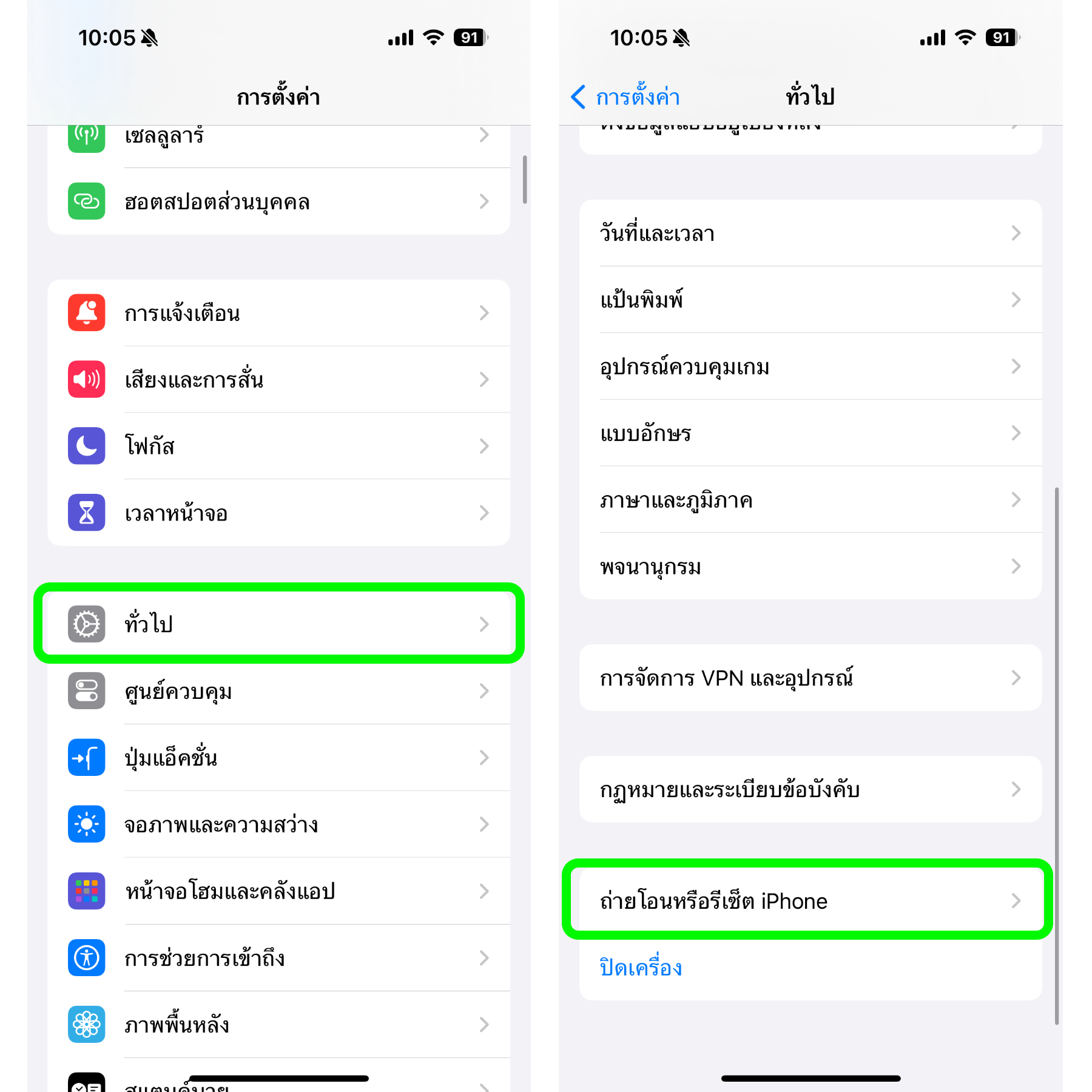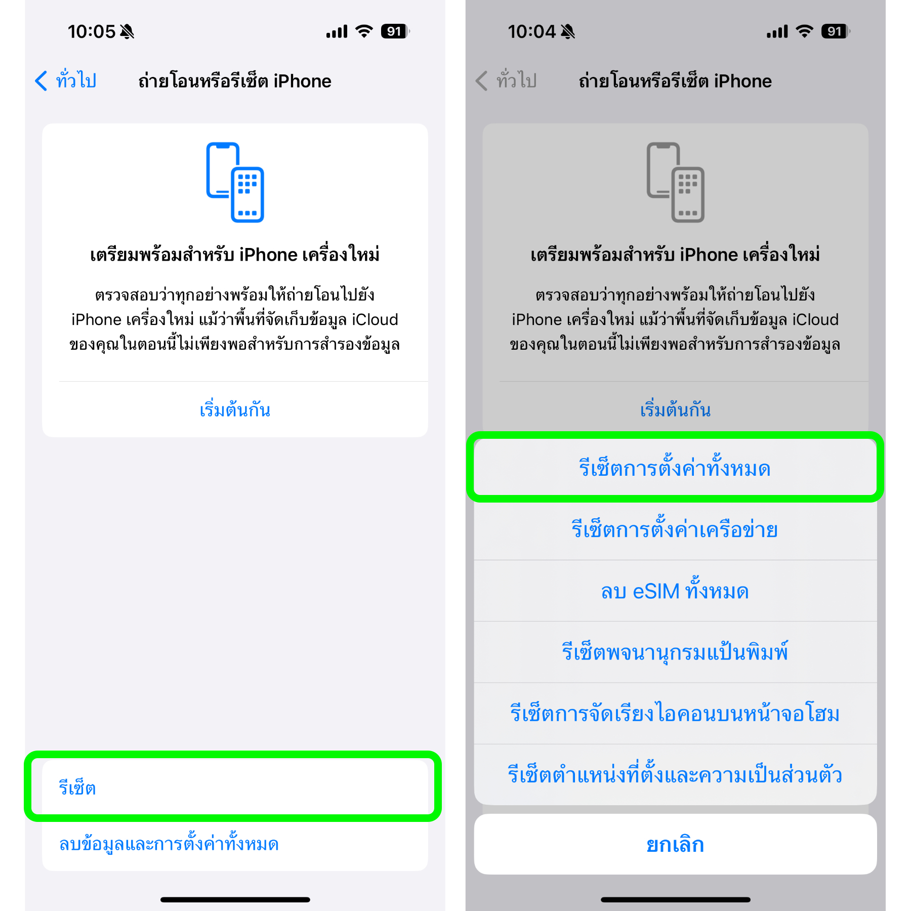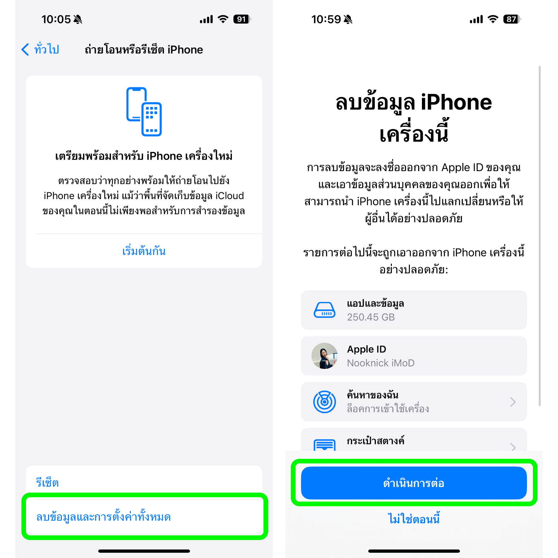 ไปที่ การตั้งค่า (Setting) > ทั่วไป (General) > ถ่ายโอนหรือรีเซ็ต iPhone (Transfer or Reset iPhone) > ลบข้อมูลและการตั้งค่าทั้งหมด (Erase All Content and Settings) > แตะ “ดำเนินการต่อ” > ใส่รหัส iPhone