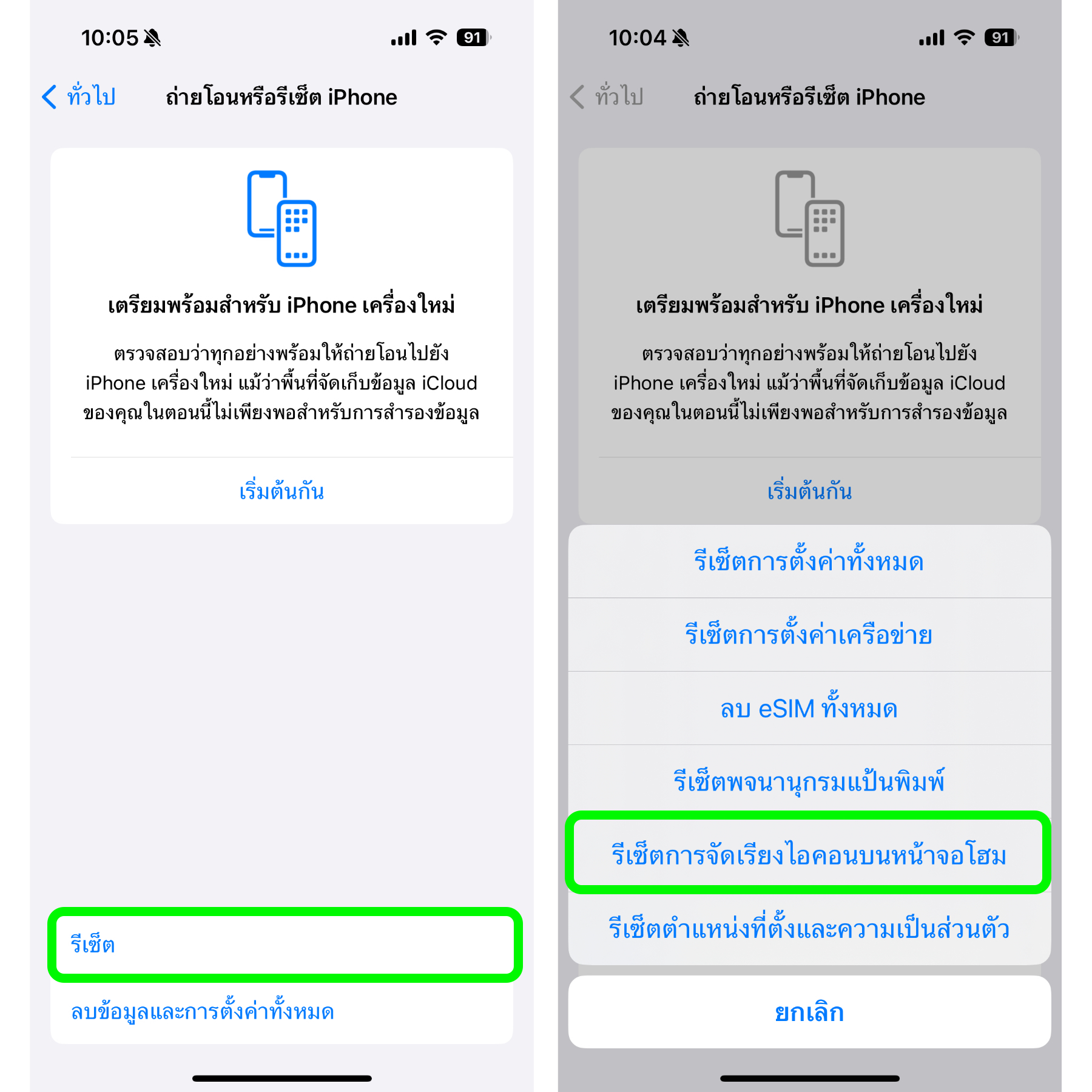 ไปที่ การตั้งค่า (Setting) > ทั่วไป (General) > ถ่ายโอนหรือรีเซ็ต iPhone (Transfer or Reset iPhone) > รีเซ็ต (Reset) > รีเซ็ตการเรียงไอคอนบนหน้าจอโฮม (Reset Home Screen Layout) > แตะ “รีเซ็ตหน้าจอโฮม (Reset Home Screen)”