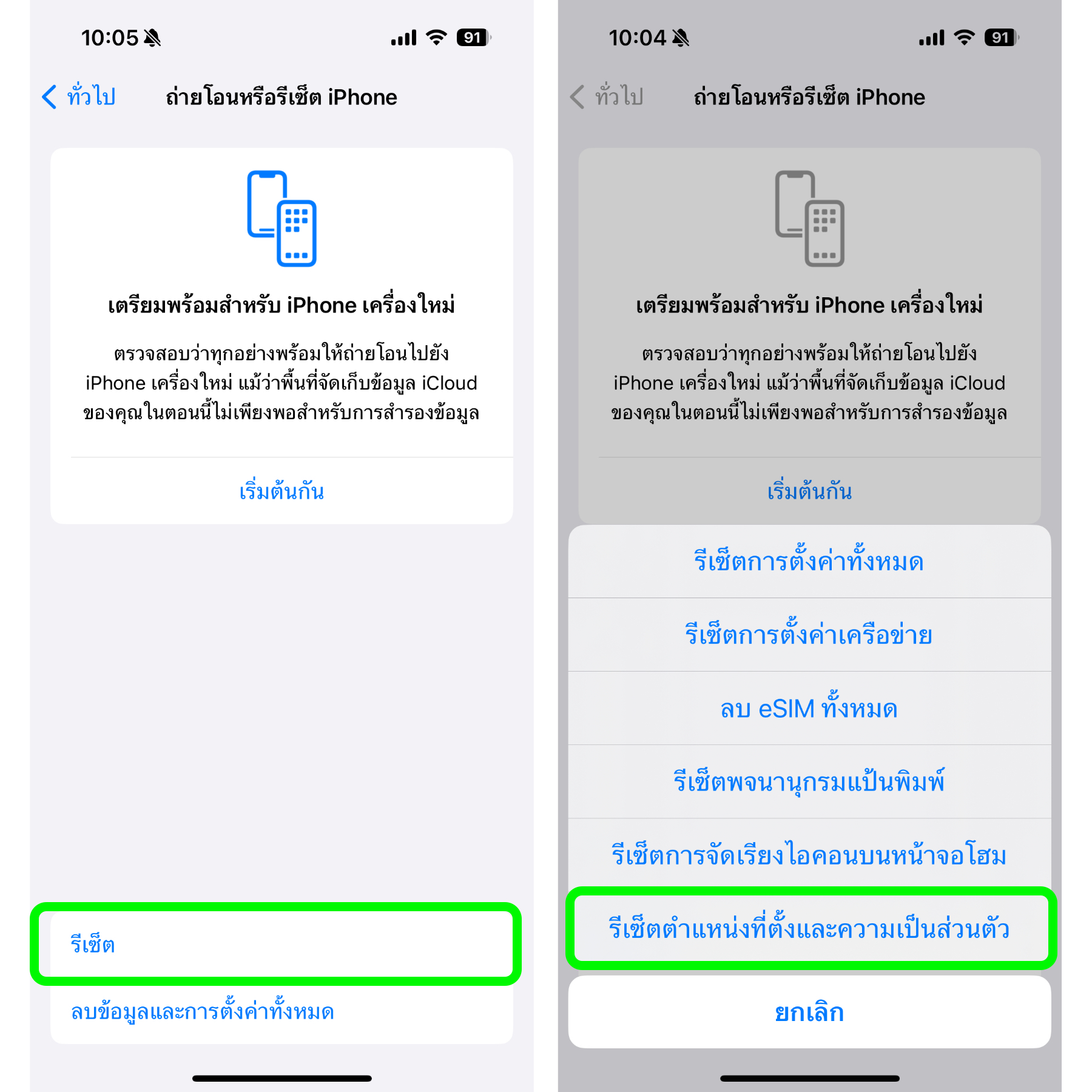 ไปที่ การตั้งค่า (Setting) > ทั่วไป (General) > ถ่ายโอนหรือรีเซ็ต iPhone (Transfer or Reset iPhone) > รีเซ็ต (Reset) > รีเซ็ตตำแหน่งที่ตั้งและความเป็นส่วนตัว (Reset Location & Privacy) > กรอกรหัส iPhone