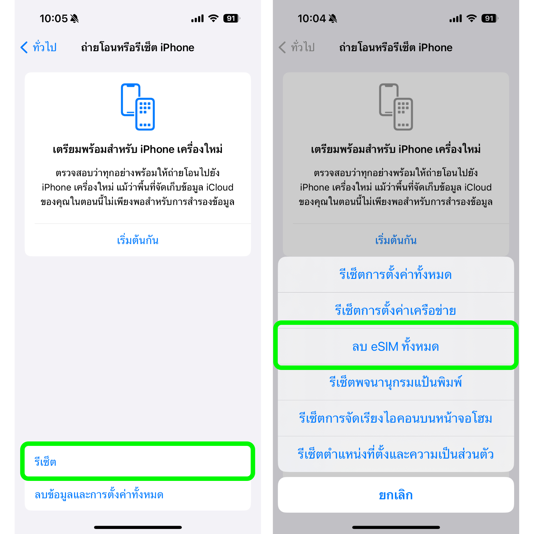 ไปที่ การตั้งค่า (Setting) > ทั่วไป (General) > ถ่ายโอนหรือรีเซ็ต iPhone (Transfer or Reset iPhone) > รีเซ็ต (Reset) > ลบ eSIM ทั้งหมด > ใส่รหัสผ่าน iPhone